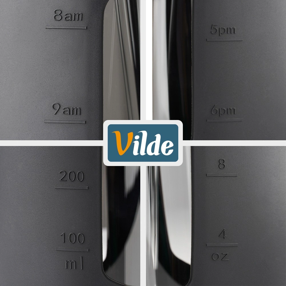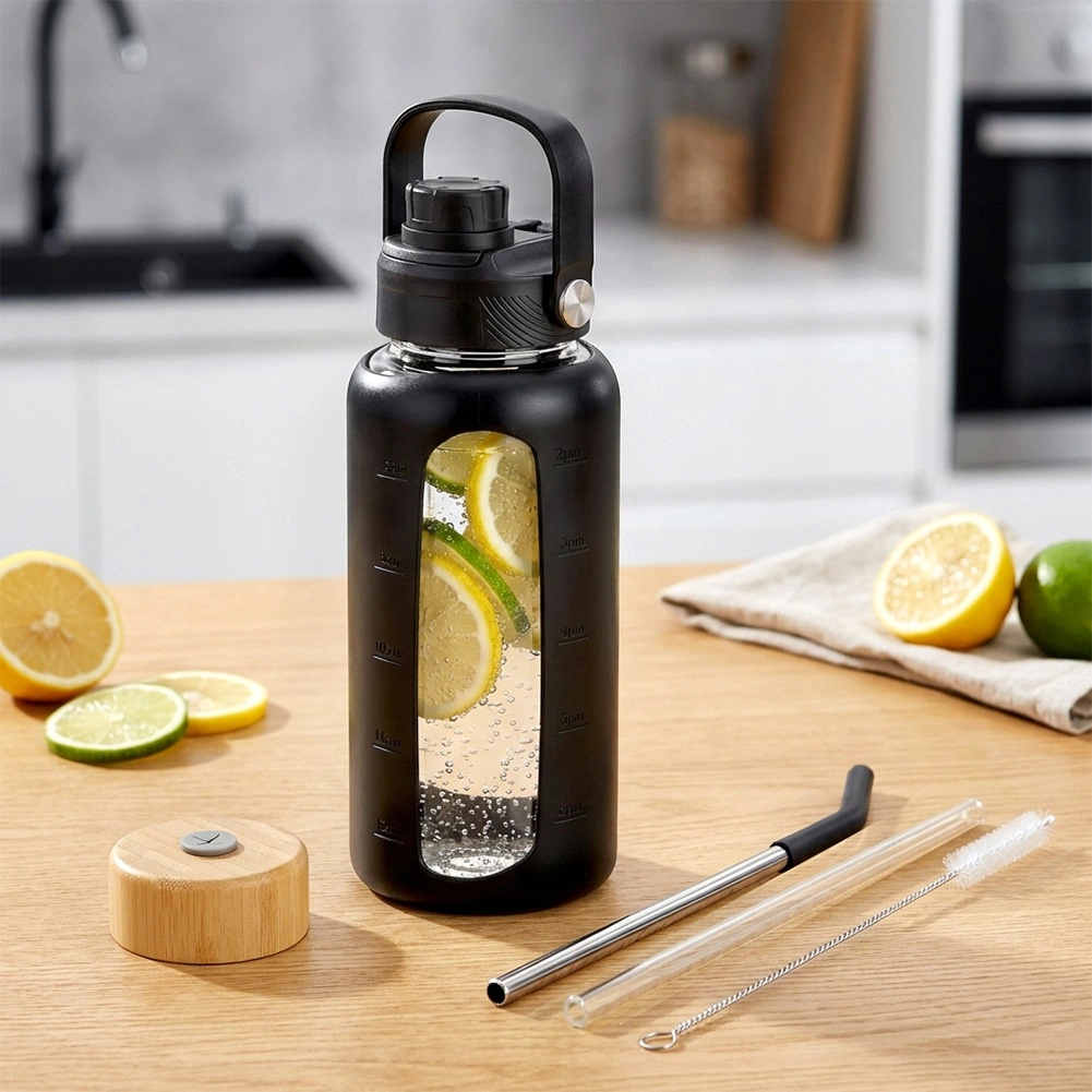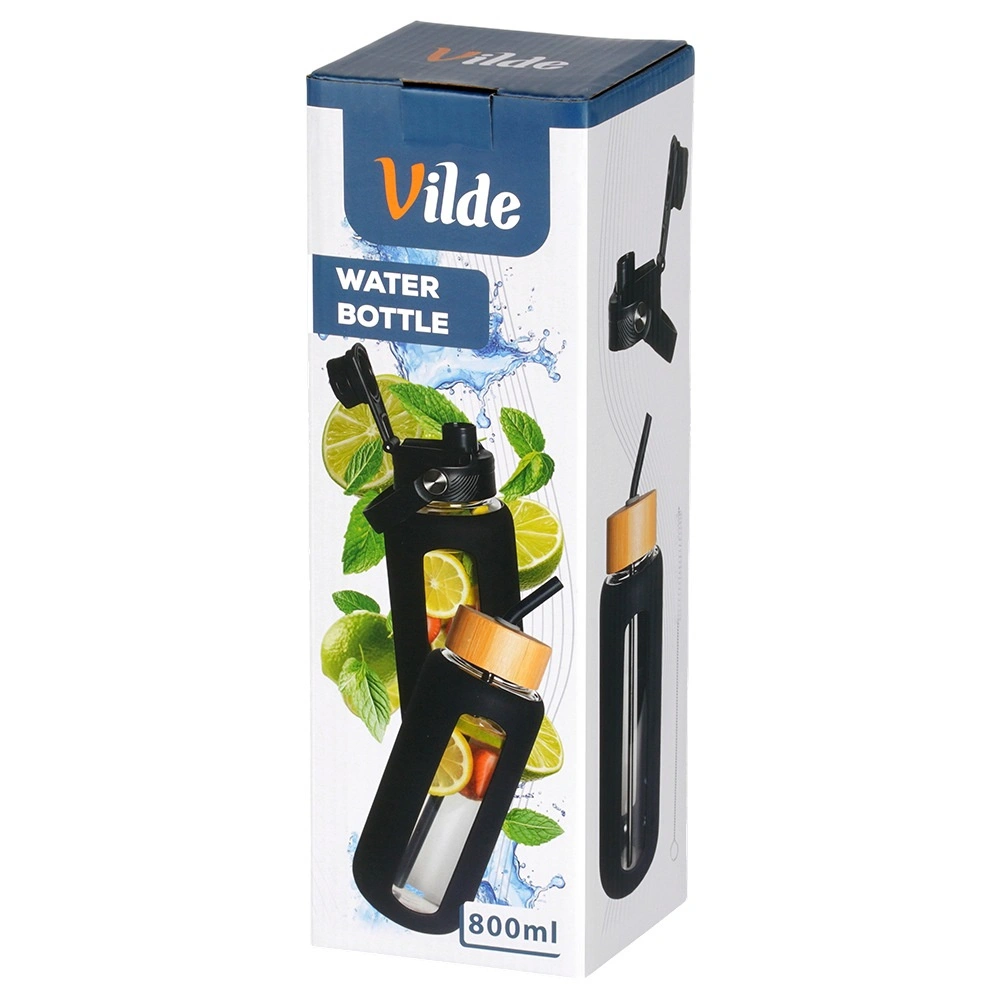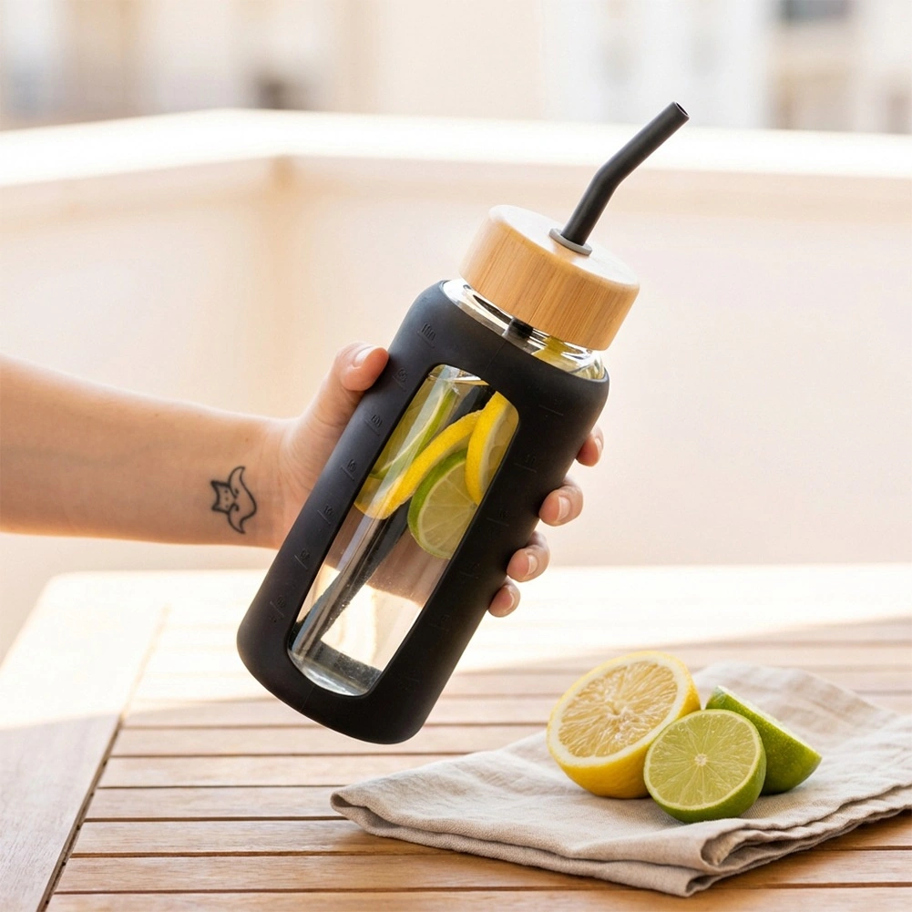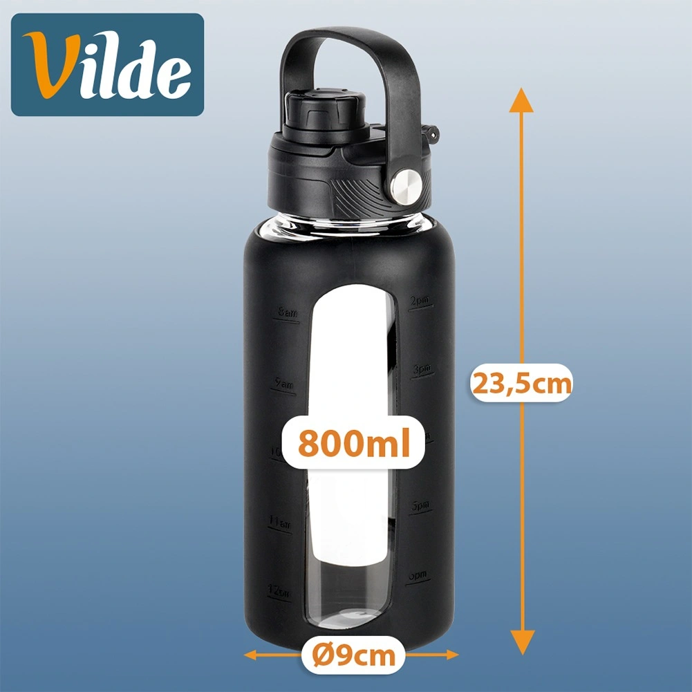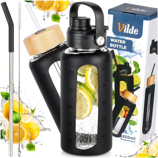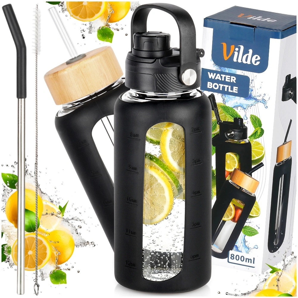 Stilska steklena steklenička za vodo s prostornino 800 ml ponuja odporno borosilikatno steklo, zaščitni silikonski ovitek z okencem in merilnimi črtami ter dva zamenljiva pokrovčka za pitje po slamici ali prek športnega ustnika. Zahvaljujoč merilniku v ml in oz ter časovnim oznakam zlahka spremljate dnevni vnos tekočine. Primerna za tople in hladne napitke, za doma, v službo ali na pot.