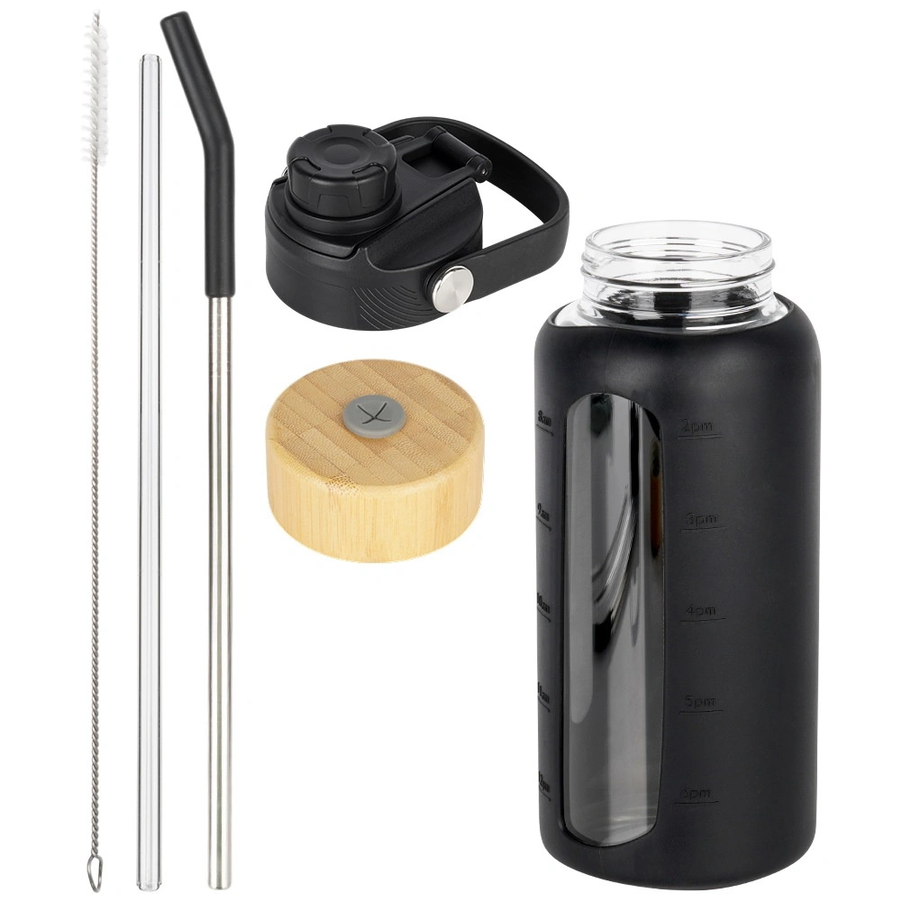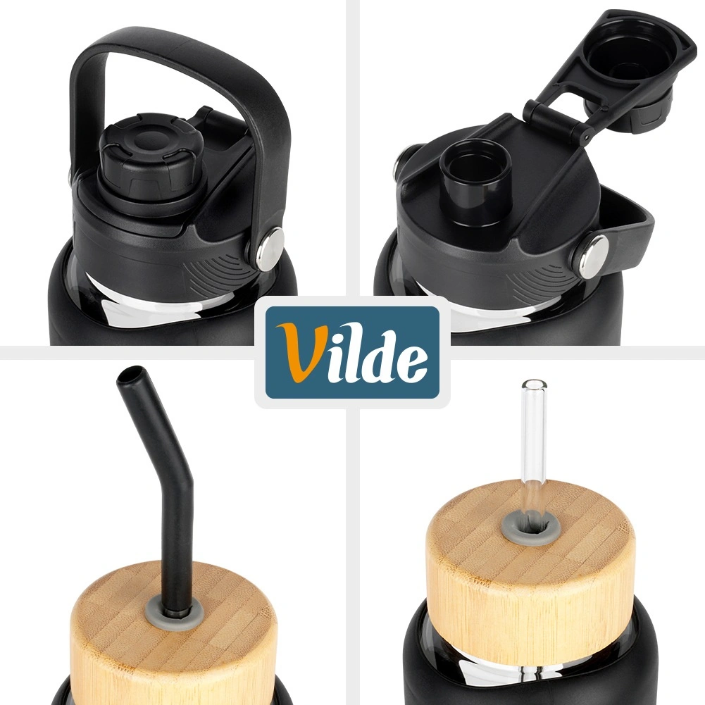 Športni flip pokrovček z ustnikom in ročajem za enostavno prenašanje, bambusov pokrovček z odprtino za slamico. V kompletu sta steklena in inox slamica s silikonsko konico ter čistilna ščetka.