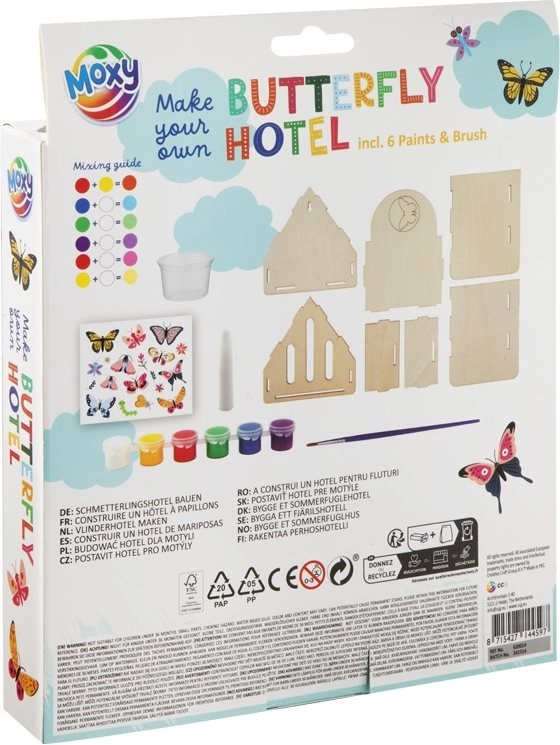 Sestavite svoje lastno zatočišče za metulje s tem ustvarjalnim kompletom MOXY. Paket vsebuje vse, kar potrebujete za sestavljanje in okrasitev hišice: lesene dele iz balse, akrilne barve, čopič, lepilo in slikovni priročnik. Idealno za družinsko ustvarjanje, razvoj ustvarjalnosti in podporo naravi na vrtu.