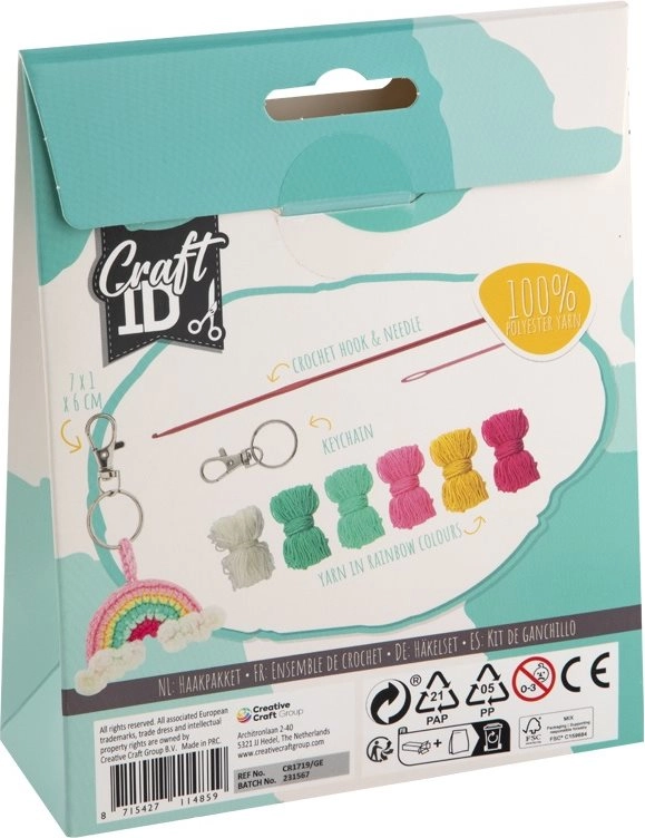Ustvarite svoj kvačkan obesek za ključe v obliki mavrice s to praktično setom CRAFT ID. Primeren za začetnike in napredne, obesek je prisrčen, izviren in odličen kot darilo. V paketu je vse potrebno: preja, polnilo, kvačka in plastična igla, zato lahko začnete takoj.