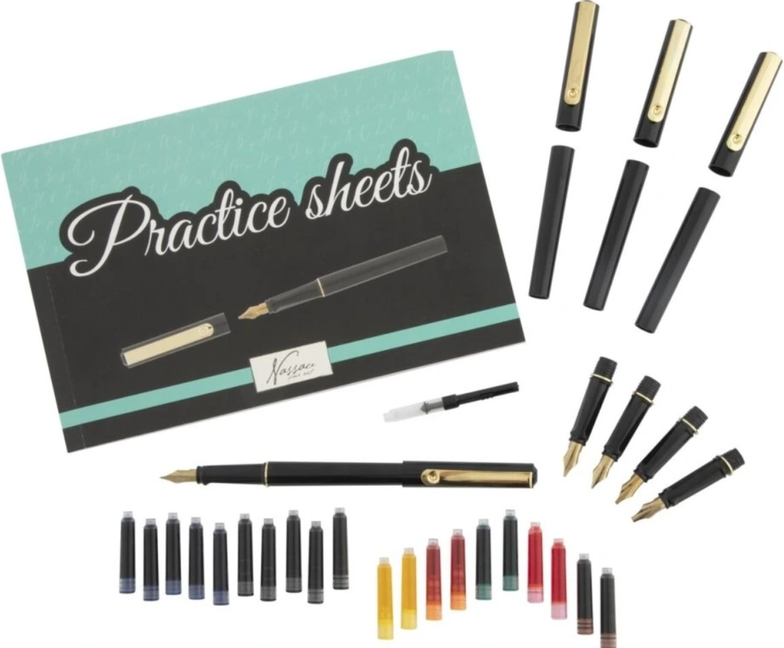 V pakiranju najdete vse, kar potrebujete za vadbo in končno ustvarjanje – od petih elegantnih per prek zamenljivih konic do priročnega vadbenega zvezka za postopno izpopolnjevanje tehnike. Set je zasnovan za udobno pisanje, tekoč pretok črnila in čiste linije.