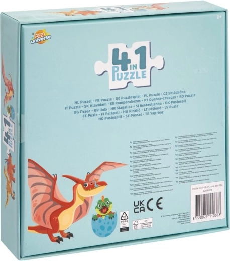 Odkrijte zabavno in izobraževalno progresivno sestavljanko 4v1 z motivom dinozavrov znamke TOY UNIVERSE. Štiri sestavljanke s 4, 6, 9 in 12 koščki s postopno naraščajočo težavnostjo razvijajo fino motoriko, logično razmišljanje in potrpežljivost otrok. Vsaka sestavljena slika ima kompakten format približno 17,4 × 17,4 cm.