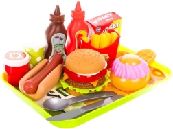 Popolna fast food oprema, vključno z burgerjem, hot dogom, pomfritom, pijačo in sladicami. Otroci si sestavijo svoj meni in krepijo domišljijo.