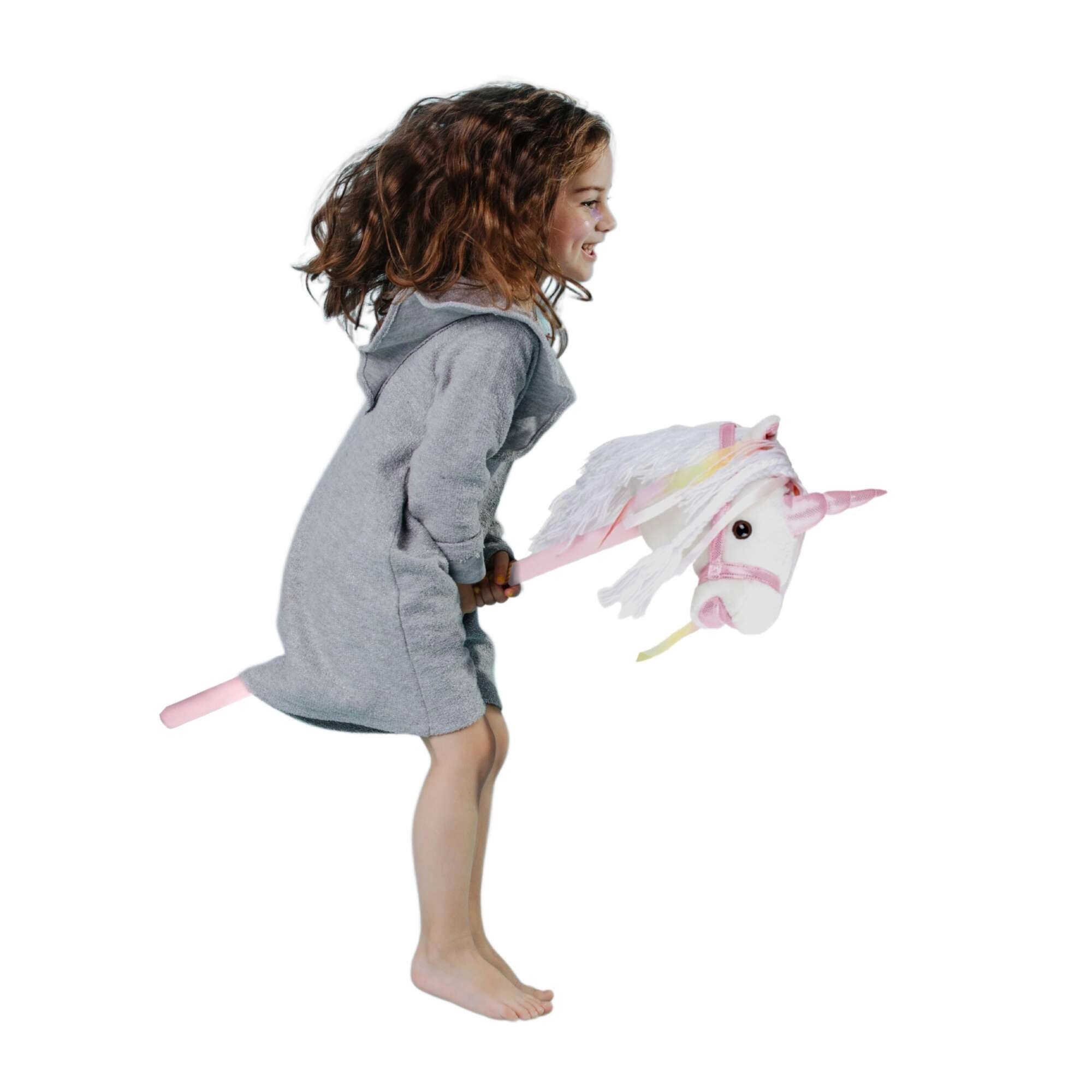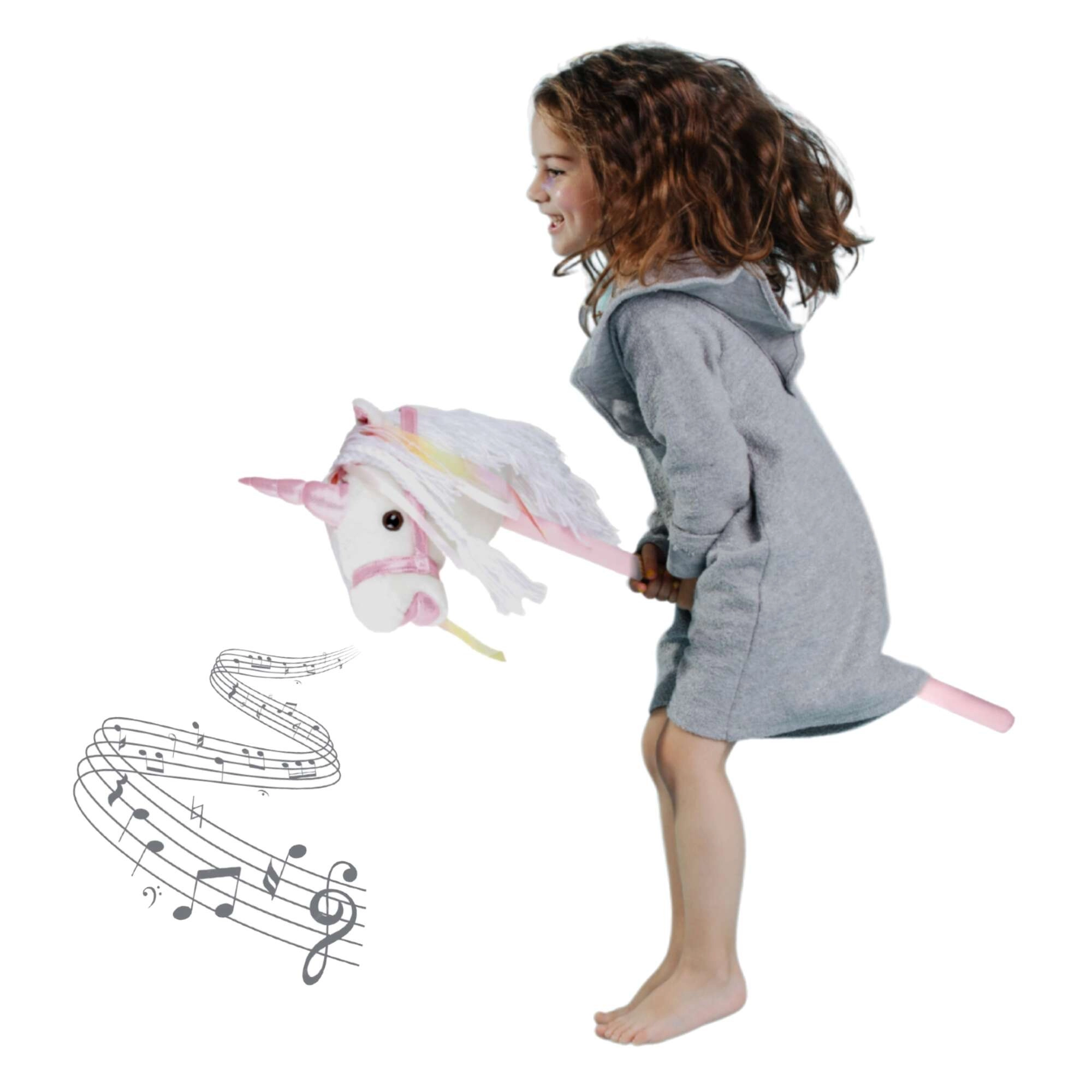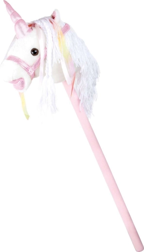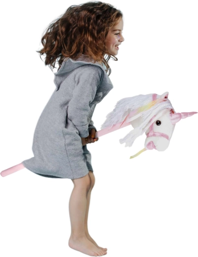 Ta samorog na palici spodbuja gibanje, domišljijo in igranje vlog. Nežen pliš je prijeten na otip, okrasna griva in trakovi pa vsaki ježi dodajo čarobno vzdušje. Po pritisku na gumb v ušesu se oglasijo realistični zvoki kasa in rezgetanja, ki otrokom še bolj oživijo igro jahanja.