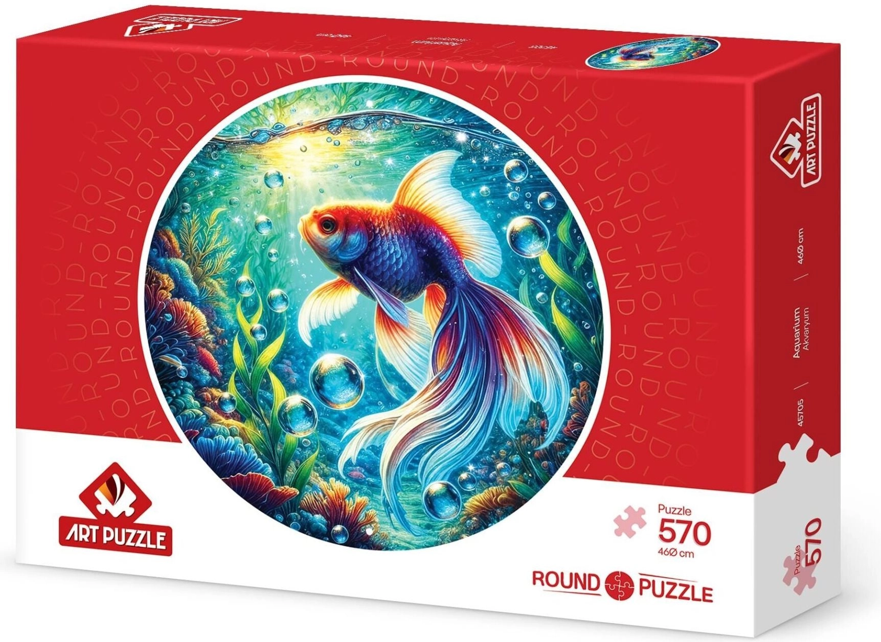 Ti okrogli puzzle z motivom akvarija so odlična izbira za ljubitelje sestavljank, ki iščejo nekaj netradicionalnega. 570 kakovostnih koščkov ustvari podrobno in barvito sliko, polno rib in podvodnih elementov, ki bo razveselila začetnike in izkušene sestavljavce.