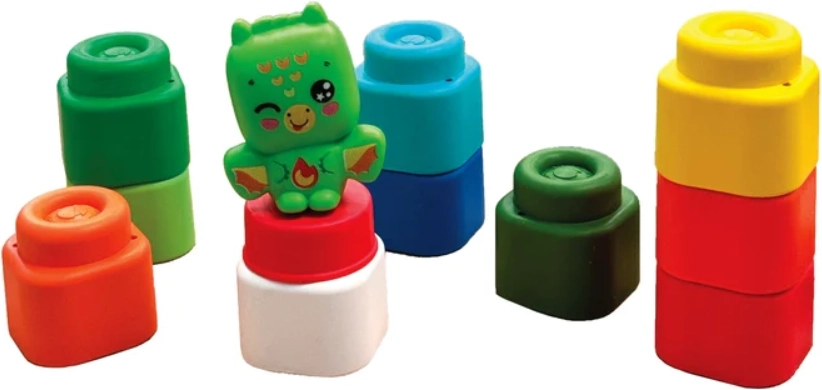 Zaradi enostavnega prijema otroci kocke z lahkoto združujejo in gradijo prve stolpiče ter konstrukcije. Igra naravno razvija fino motoriko, koordinacijo oko–roka, ustvarjalnost in podpira senzorično zaznavanje. Zabavo dopolnjuje ljubka figurica zmaja, ki vabi k zgodbam in igram vlog.