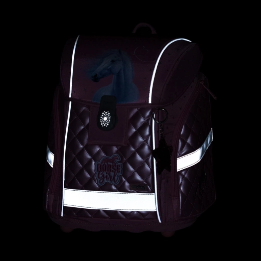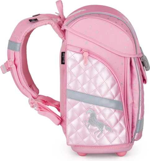 Lahek in udoben šolski komplet za mlajše šolarke z motivom konja. Vključuje prostorno aktovko z ergonomskim hrbtnim sistemom, vrečko za copate in enopredalčni peresnik. Zaradi lahke konstrukcije tehta aktovka le 970 g, ima odsevne elemente, magnetno zapiranje in praktično razporeditev za pregledno shranjevanje šolskih potrebščin.