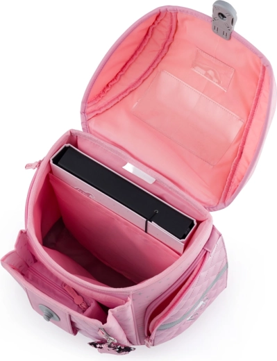 Šolski komplet PREMIUM LIGHT – Horse Girl navduši s čudovitim romantičnim dizajnom v rožnatih tonih in motivom belega konja. Glavna aktovka ponuja ergonomsko oblikovan hrbtni del iz zračnega materiala, široke podložene naramnice s prsnim in zateznimi trakovi za popolno prileganje in enakomerno porazdelitev teže. Zaradi lahke konstrukcije je idealna za najmlajše šolarke od višine približno 121 cm.