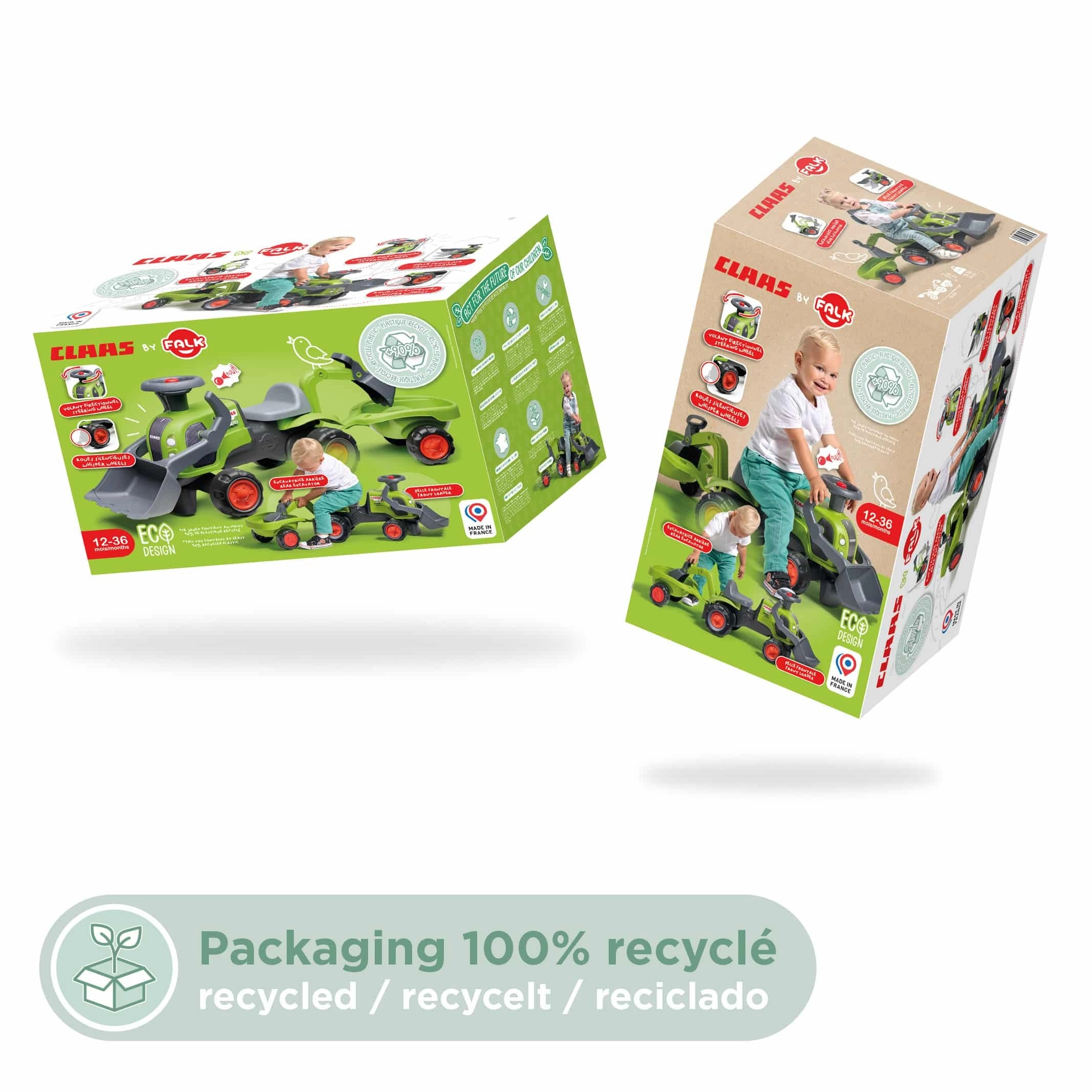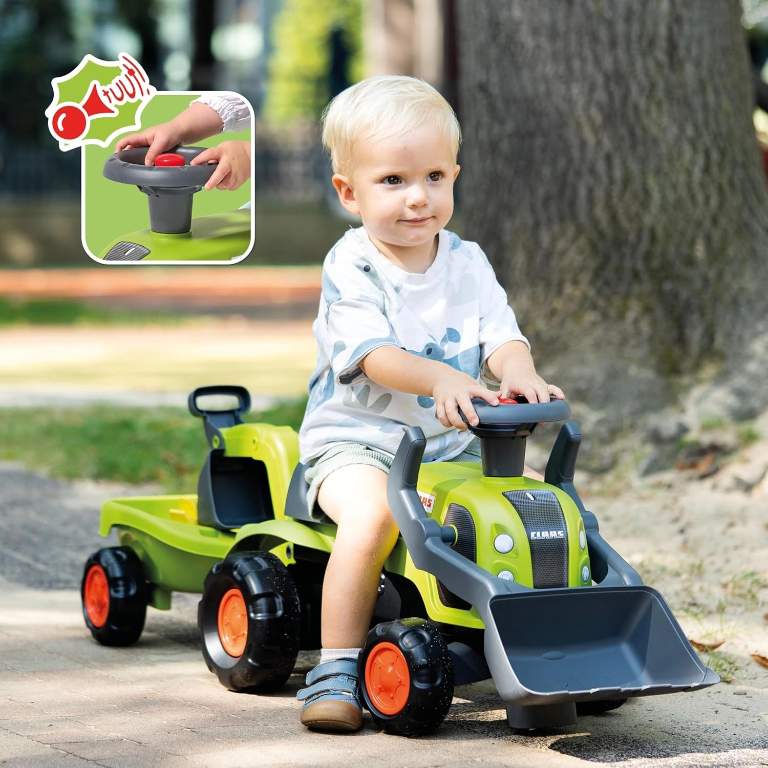 V paketu so poganjalec traktor z licenco CLAAS, odklopljiva prikolica, sprednja žlica, zadnja bagerska roka in volan s hupo – pripravljeno za akcijo na vsakem »gradbišču«.