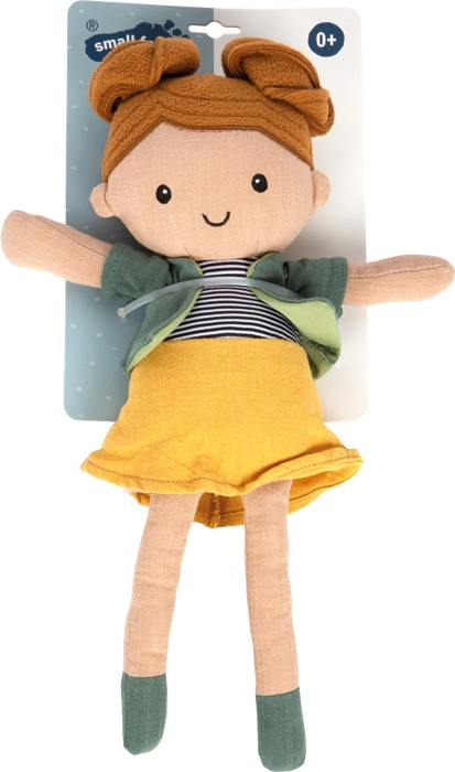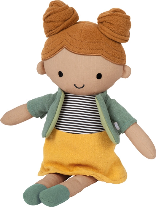Maja nosi rumeno krilo, črtast zgornji del in zeleni pulover/jopico, ki ju je mogoče zlahka obleči in sleči. To naravno uri fino motoriko in samostojnost. Punčka je ročno pralna, zato ohranja obliko, čistočo in dolgo življenjsko dobo.