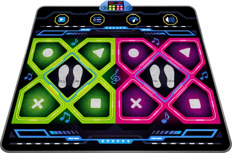 Vgrajena nadzorna plošča z zvočnikom omogoča nastavitev glasnosti ter izbor 3 igralnih načinov in 3 stopenj težavnosti. Trpežna površina, protizdrsna zasnova in velika mera 105 × 90 cm zagotavljajo udobje in varnost pri plesu. Odlično za doma, otroške zabave in druženja s prijatelji.