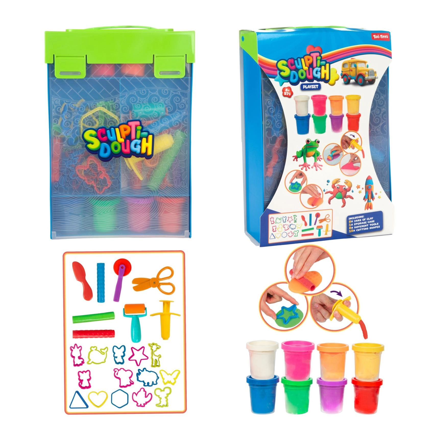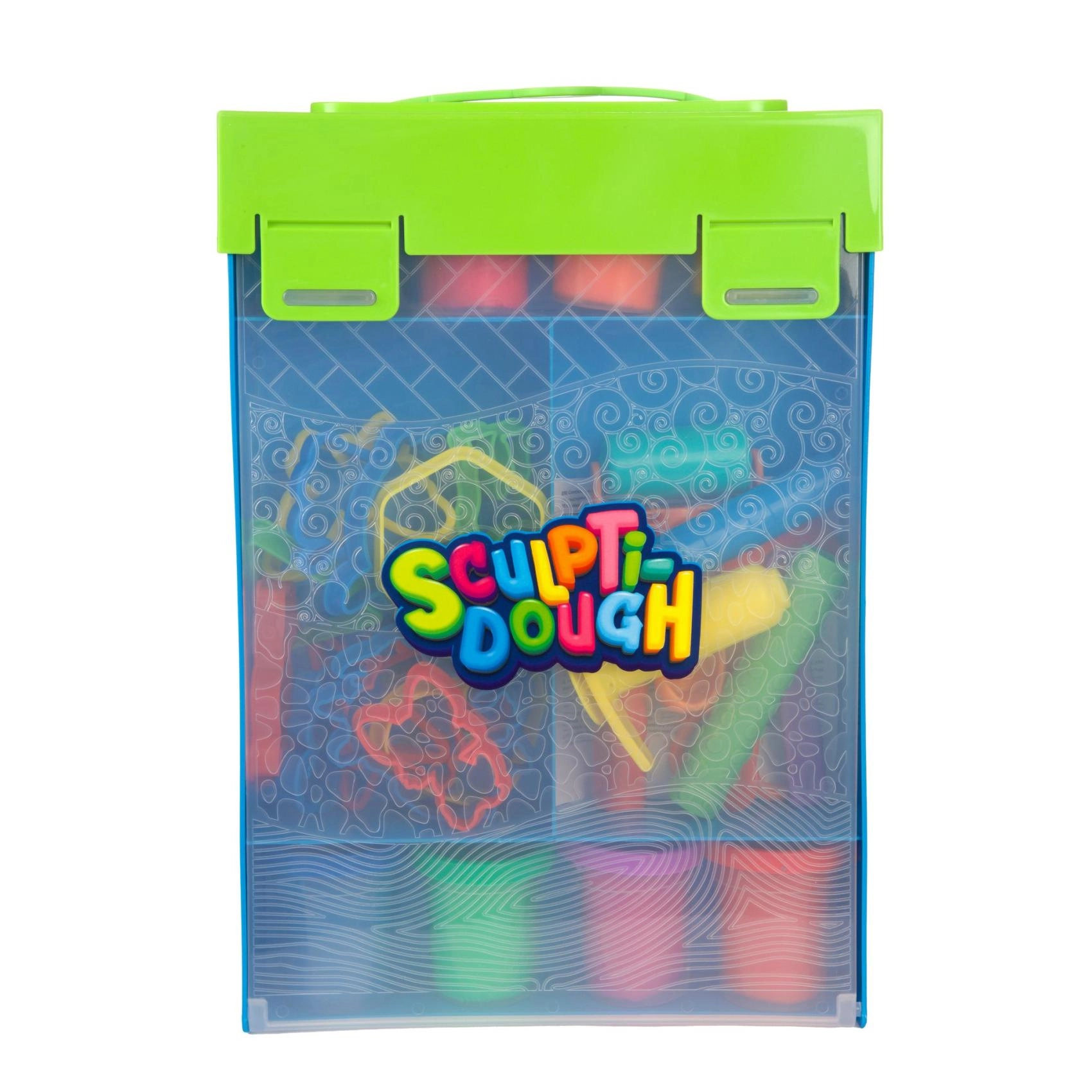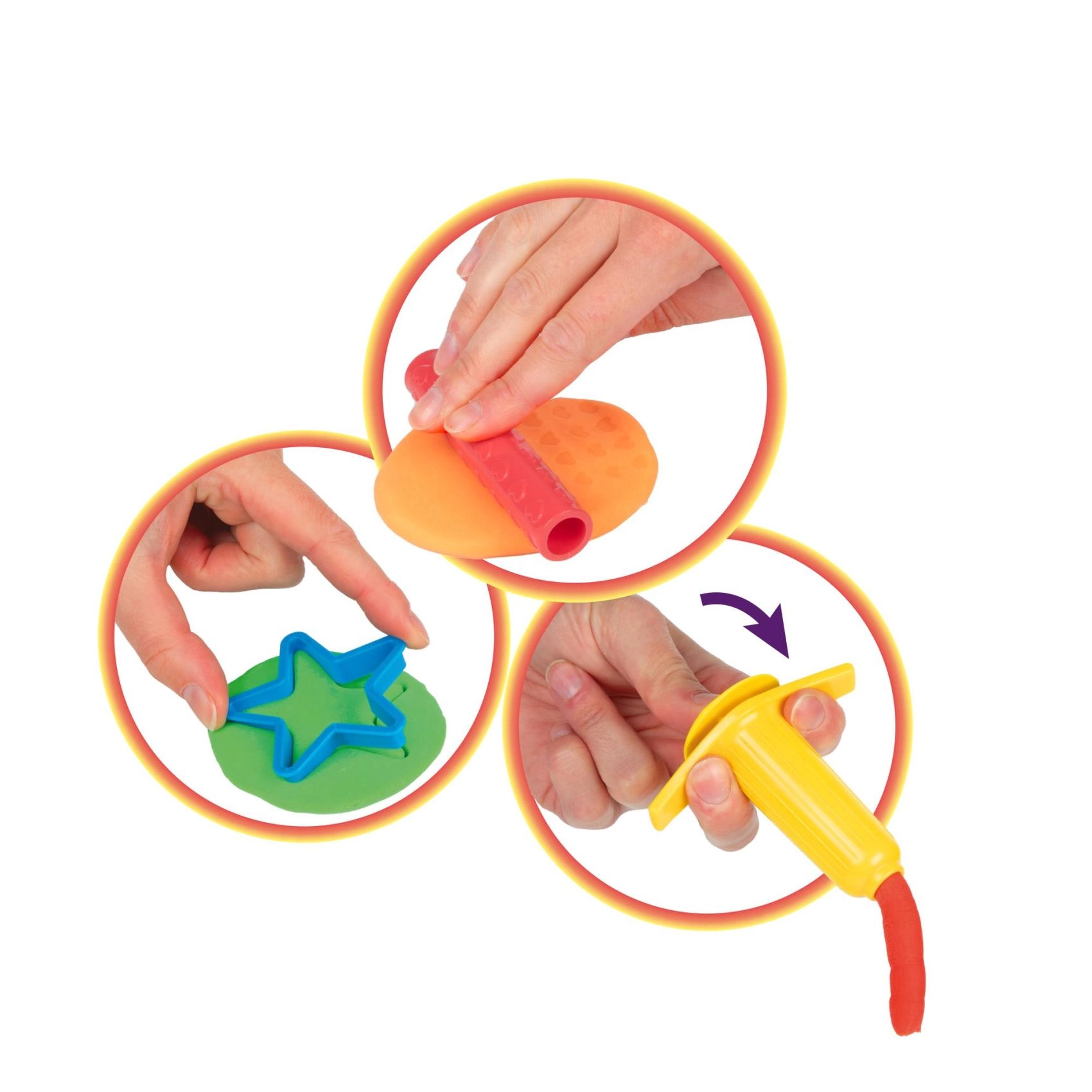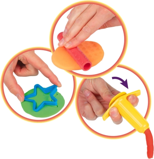 V kompletu je širok nabor orodij in modelčkov – valjček, kolutni rezalniki, škarje, nožki, teksturni valjčki in ekstruder, ki otrokom odpirajo nove možnosti modeliranja. Plastična škatla s pokrovom in ročajem ohranja lončke in dodatke skupaj, zato je set enostavno pospraviti in prenašati.