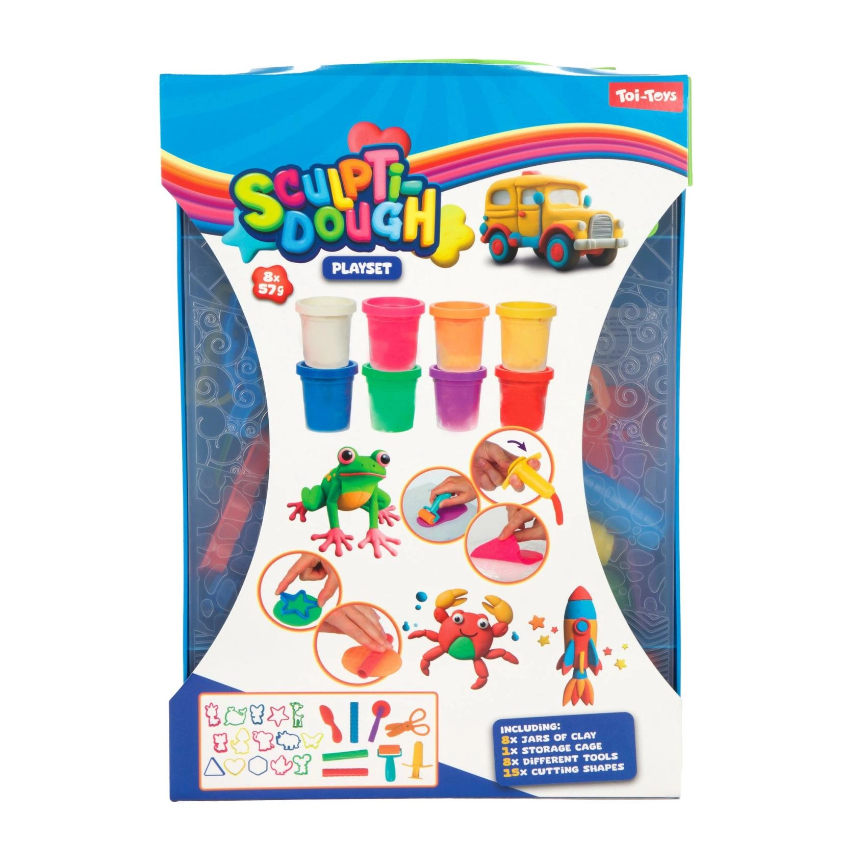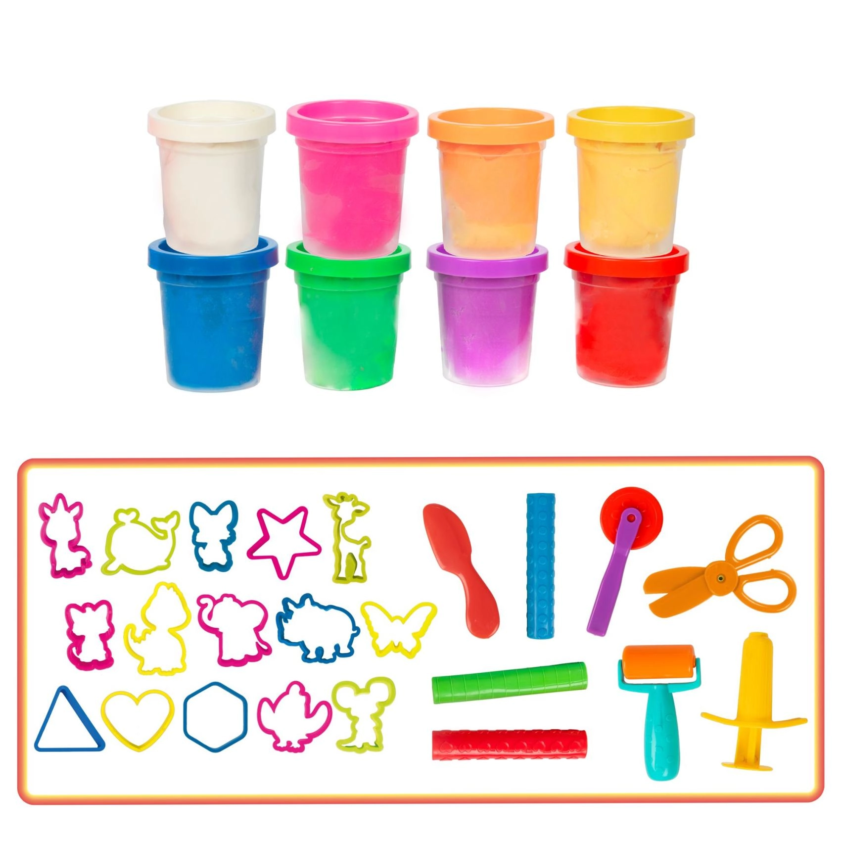 Osem lončkov plastelina dopolnjujejo valjčki, nožki, škarje in modelčki – otroci lahko takoj začnejo ustvarjati brez dodatnih nakupov.