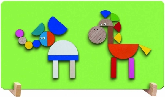 Upravljanje z oblikami, njihovo obračanje in polaganje na magnetno tablo krepi koordinacijo oko–roka ter uči otroke prepoznavati barve in oblike.