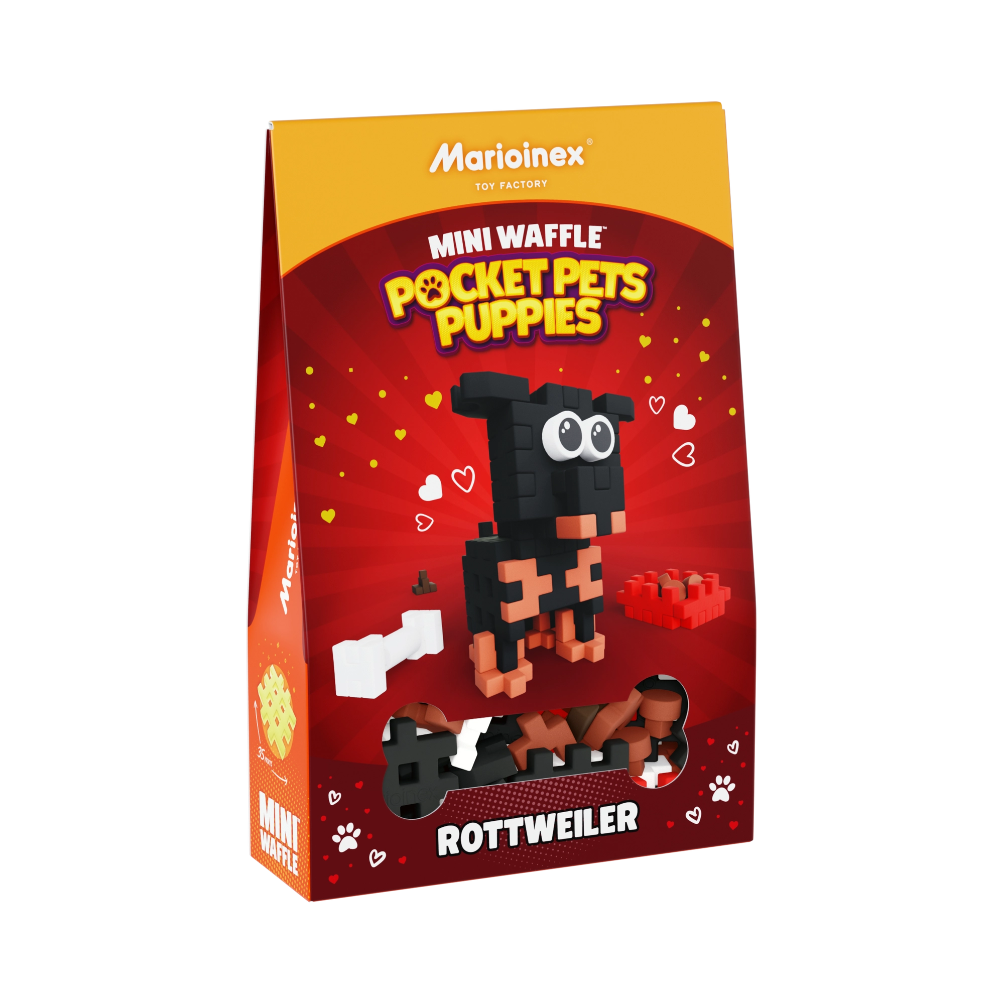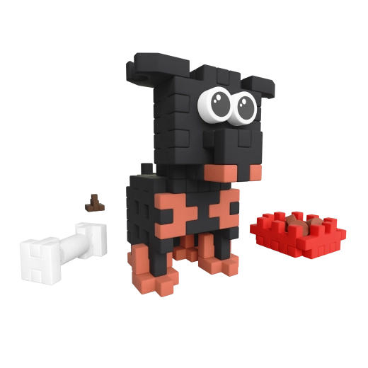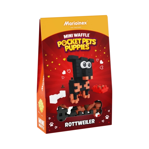 Ustvarite svojega pasjega prijatelja! Gradbeni komplet Mini Waffle Pocket Pets Rottweiler prinaša pametno kombinacijo ustvarjalnega sestavljanja in proste igre. Zahvaljujoč edinstvenim »waffle« koščkom otroci zlahka sestavijo prisrčnega mladička in njegove dodatke ter si lahko izmišljujejo lastne zgodbe. Modele je mogoče kombinirati tudi z drugimi seti Mini Waffle za še večji svet domišljije.