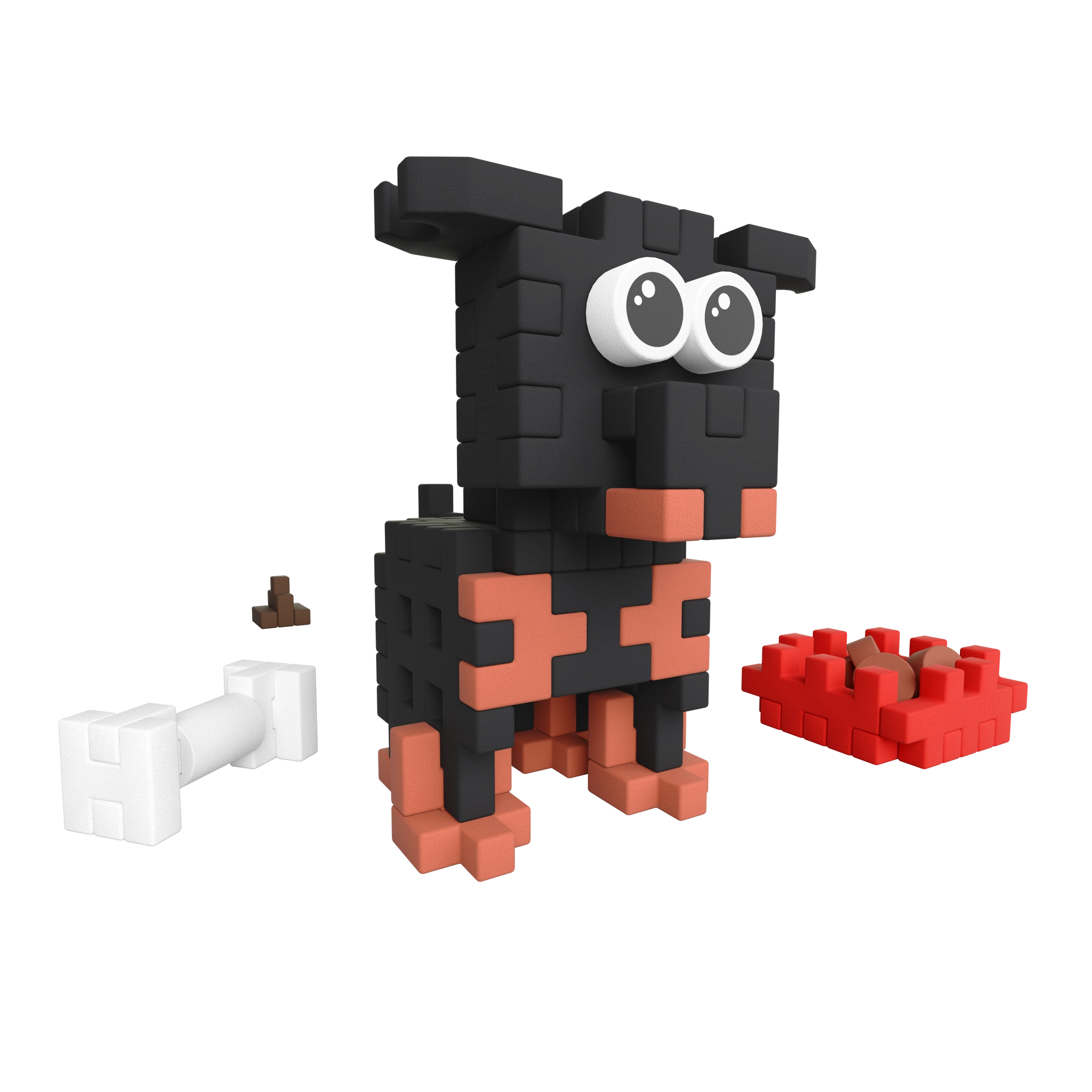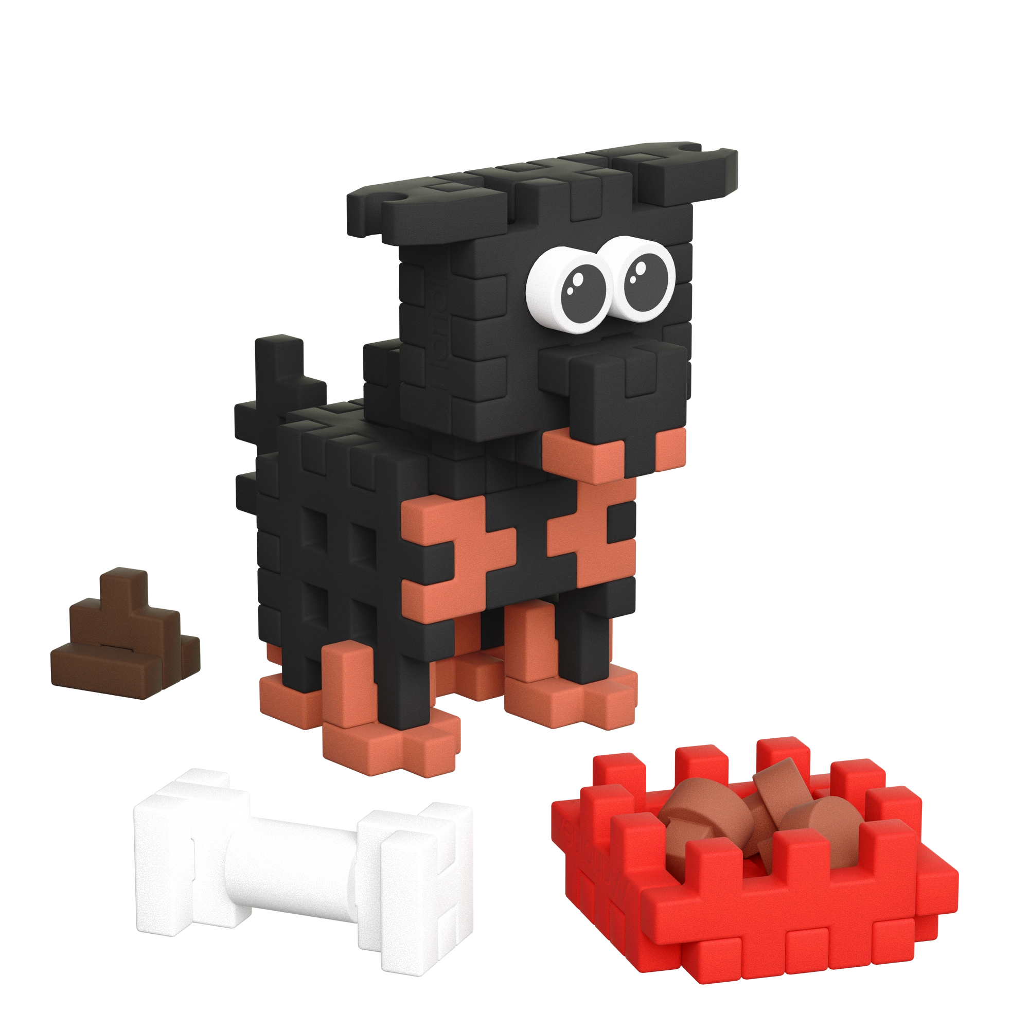 Sestavite si stilskega kužka z velikimi očmi in dodatki – posodico z briketi, kost in »kakec«. Odlična osnova za otroško pripovedno igro.