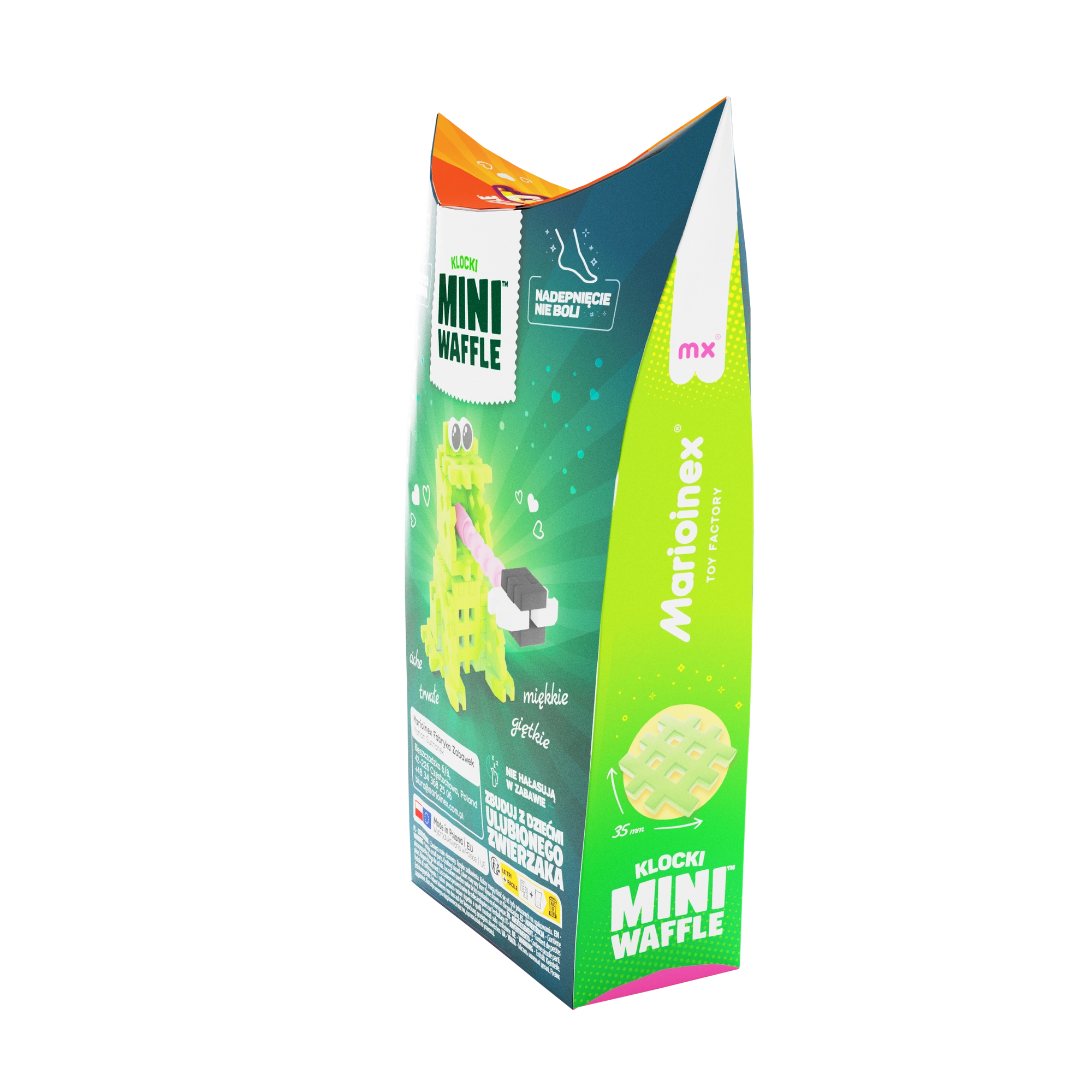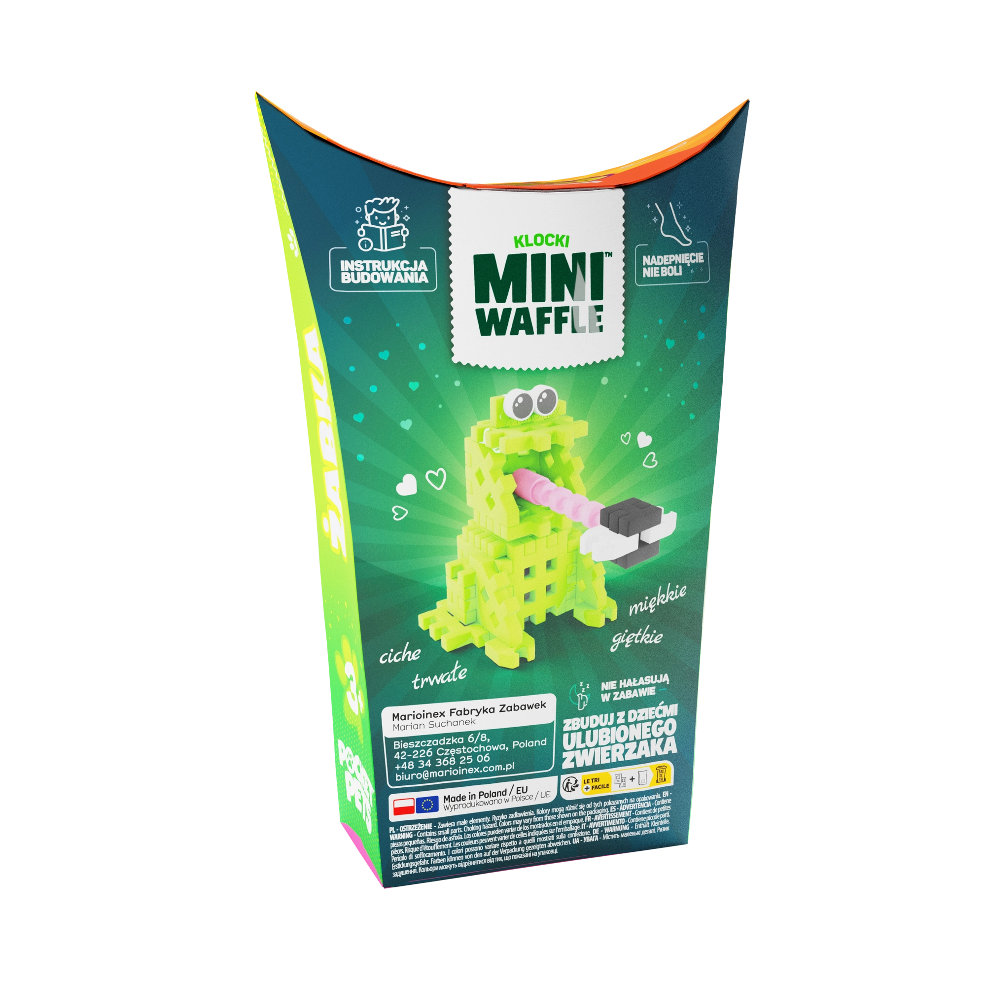 Odkrijte zabavo s stavebnico Mini Waffle Pocket Pets – žabka znamke Marioinex. Kompaktni komplet s 34 barvnimi koščki otrokom omogoča sestaviti prikupno figurico žabe, ustvarjati v 2D in 3D ter razvijati kreativnost, fino motoriko in logično razmišljanje. Deli so prožni, trpežni in varni, zlahka se povezujejo in razstavljajo ter se odlično kombinirajo z drugimi seti Mini Waffle.