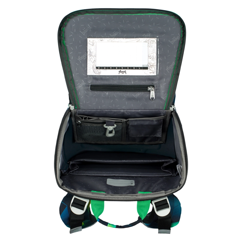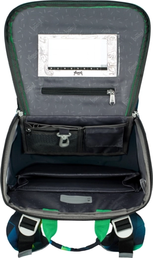 Preklopni sistem odpiranja omogoča dostop do pripomočkov kar iz šolske klopi. V notranjosti so žep za urnik, zadržni žep v pokrovu, delilne pregrade, mrežast žep in obesek za ključe za popoln red.