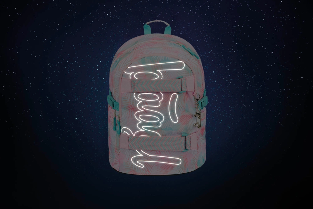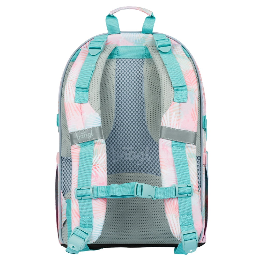 Šolski komplet BAAGL Skate Sunset je idealna izbira za učence, ki želijo združiti udobje, funkcionalnost in svež pastelni dizajn z motivom palmnih listov. Glavna zvezda je ergonomski nahrbtnik z oblazinjenim hrbtiščem, nastavljivimi ramenskimi in prsnimi trakovi ter kompresijskimi paščki. Trije predelki z organizatorjem in oblazinjeni žep za 15" prenosnik ohranijo učbenike in tehniko na varnem in odlično urejene.