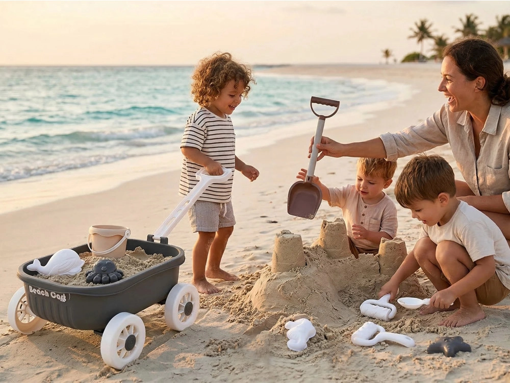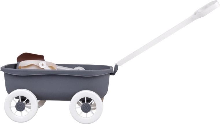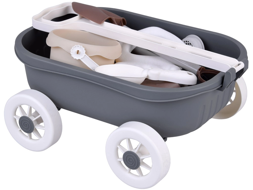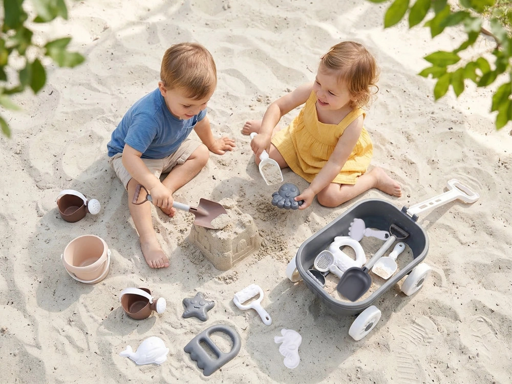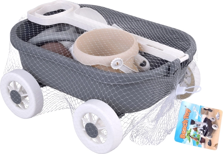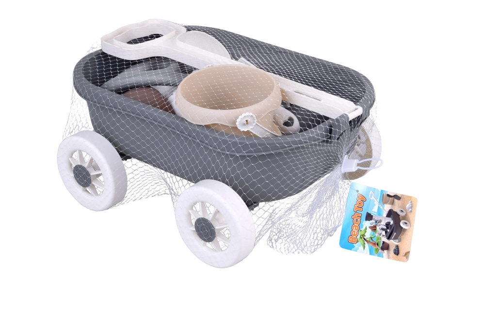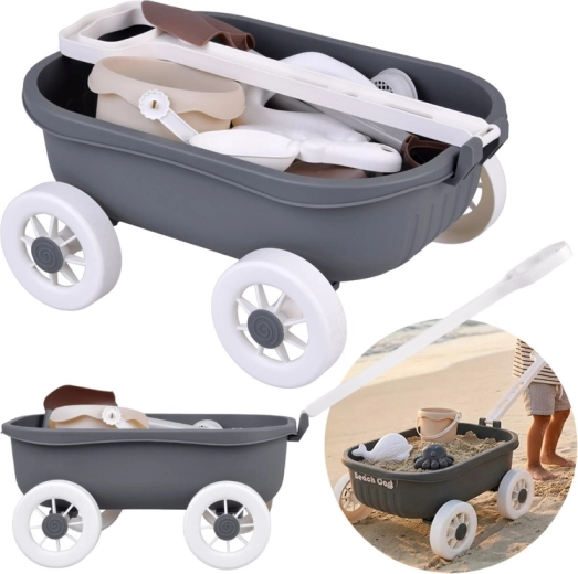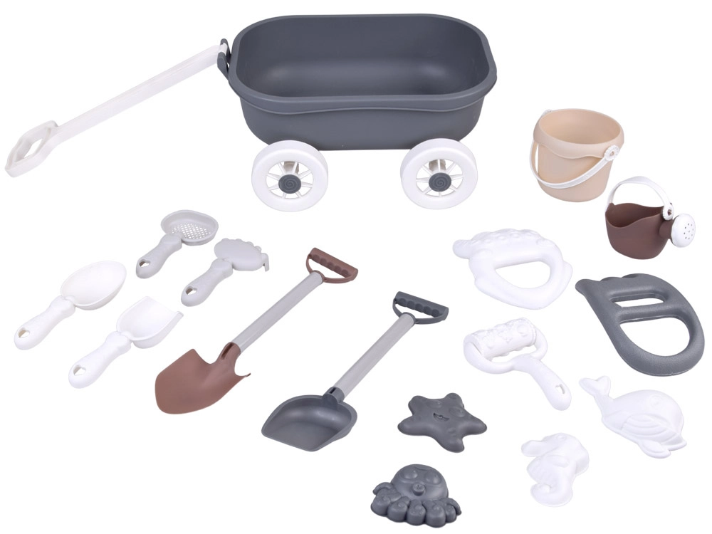 Stilski komplet za pesek s praktičnim vozičkom prinaša otrokom neskončno zabave na plaži, na vrtu in v peskovniku. Vsebuje kar 16 delov v sodobnih nevtralnih barvah, vključno z vozičkom na vleko, vedrom, kanko, lopatami in grabljami, sito ter morskimi modelčki. Trpežna plastična izvedba in široka kolesa olajšajo prevoz igrač in peska, medtem ko otroci razvijajo ustvarjalnost, fino motoriko in veselje do gibanja na prostem.