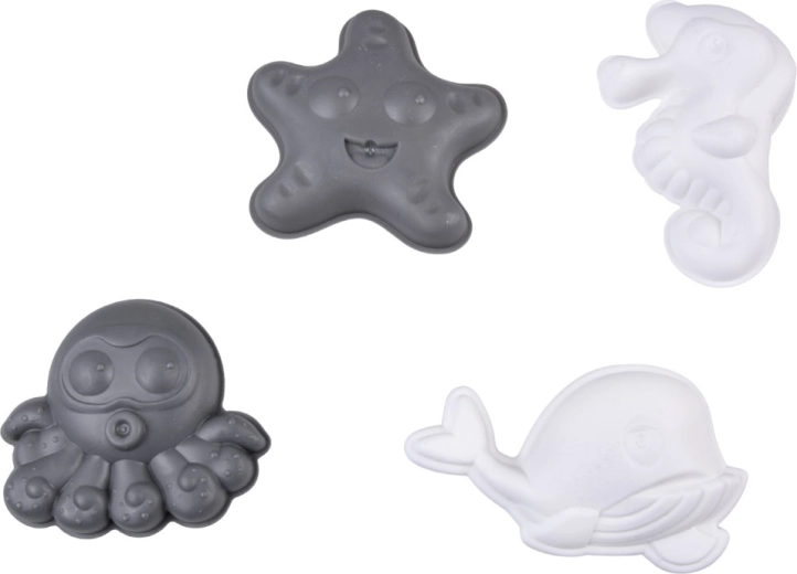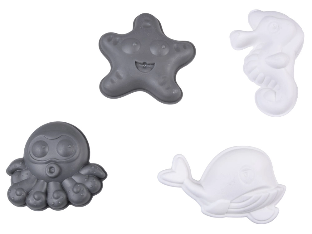 Del seta je vse, kar potrebujete za domiselno igro: 2 veliki lopati (lopata in špahtelj), 2 manjši lopatki–zajemalki, grablje in kleščaste grablje za grobejše in bolj natančno delo v pesku, sito za presejanje, vedro, kanka za zalivanje in valjček z morskim vzorcem. Ustvarjanje dopolnijo modelčki morskih živali – morska zvezda, kita, hobotnica in morski konjiček.
