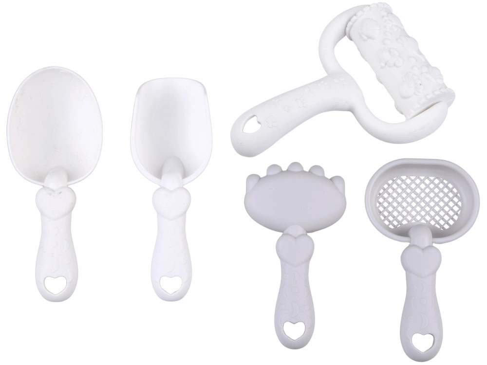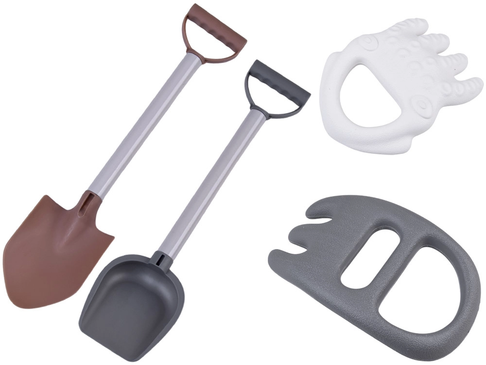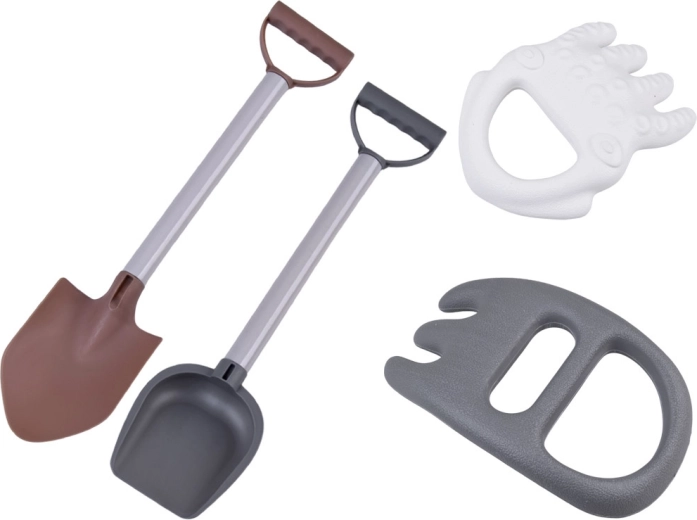 - Voziček, vedro, 2 veliki lopati (lopata in špahtelj), 2 lopatki–zajemalki, grablje, kleščaste grablje, sito, kanka, valjček z morskim vzorcem, modelčki (morska zvezda, kita, hobotnica, morski konjiček)