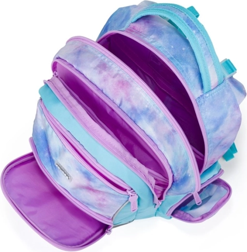 V notranjosti boste našli pregledno organizacijo – prostorni predali in žepi nudijo prostor za učbenike, zvezke in malico. Stranska žepa (eden na zadrgo, eden odprt) sta idealna za steklenico. Del seta je tudi praktična telovadna vrečka z zategovanjem na vrvico ter enoslojna peresnica z dvema preklopoma, zankami za pisala in prozorno folijo za urnik.