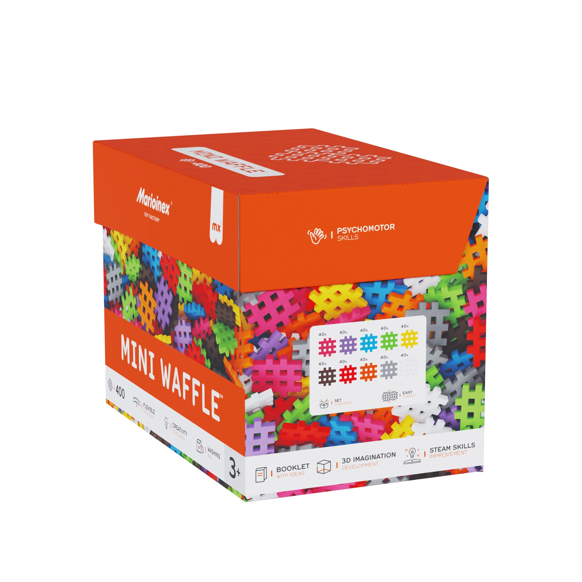 Konstrukcijski set Marioinex Mini Waffle otrokom prinaša igriv način učenja. Zaradi mehkega materiala in pametne oblike se koščki zlahka spajajo in razdružujejo, male roke pa jih udobno držijo. 400 koščkov v pisanih barvah vabi k prostemu ustvarjanju ali sledenju navodilom – od preprostih modelov do domiselnih 3D zgradb.