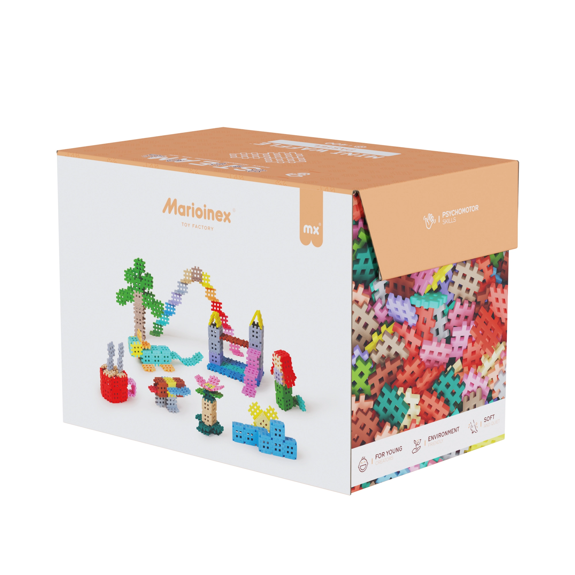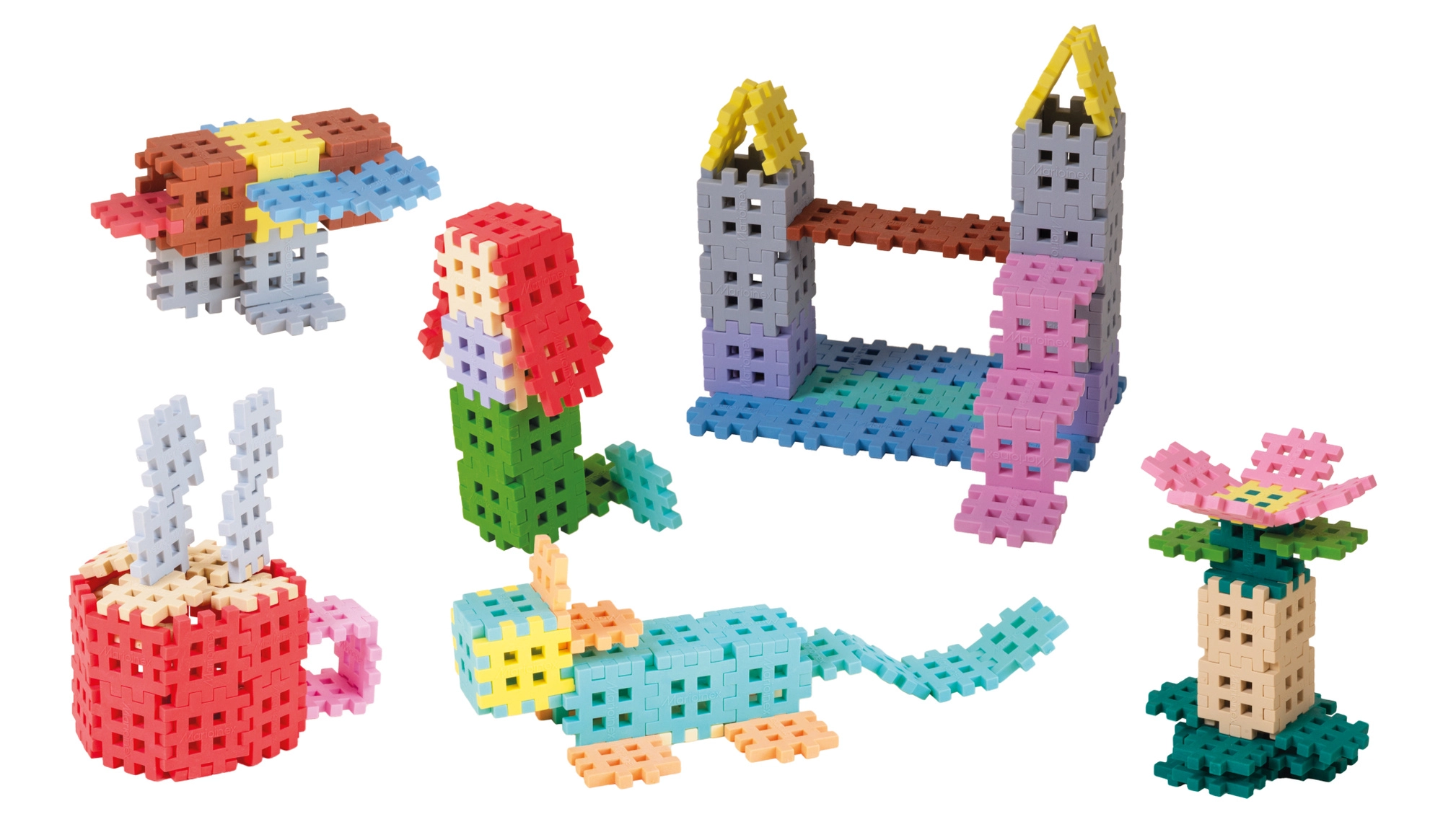 Veliko število pastelnih koščkov podpira svobodno ustvarjanje – od preprostih oblik do dovršenih 3D modelov. Odlično za samostojno in skupno igro.