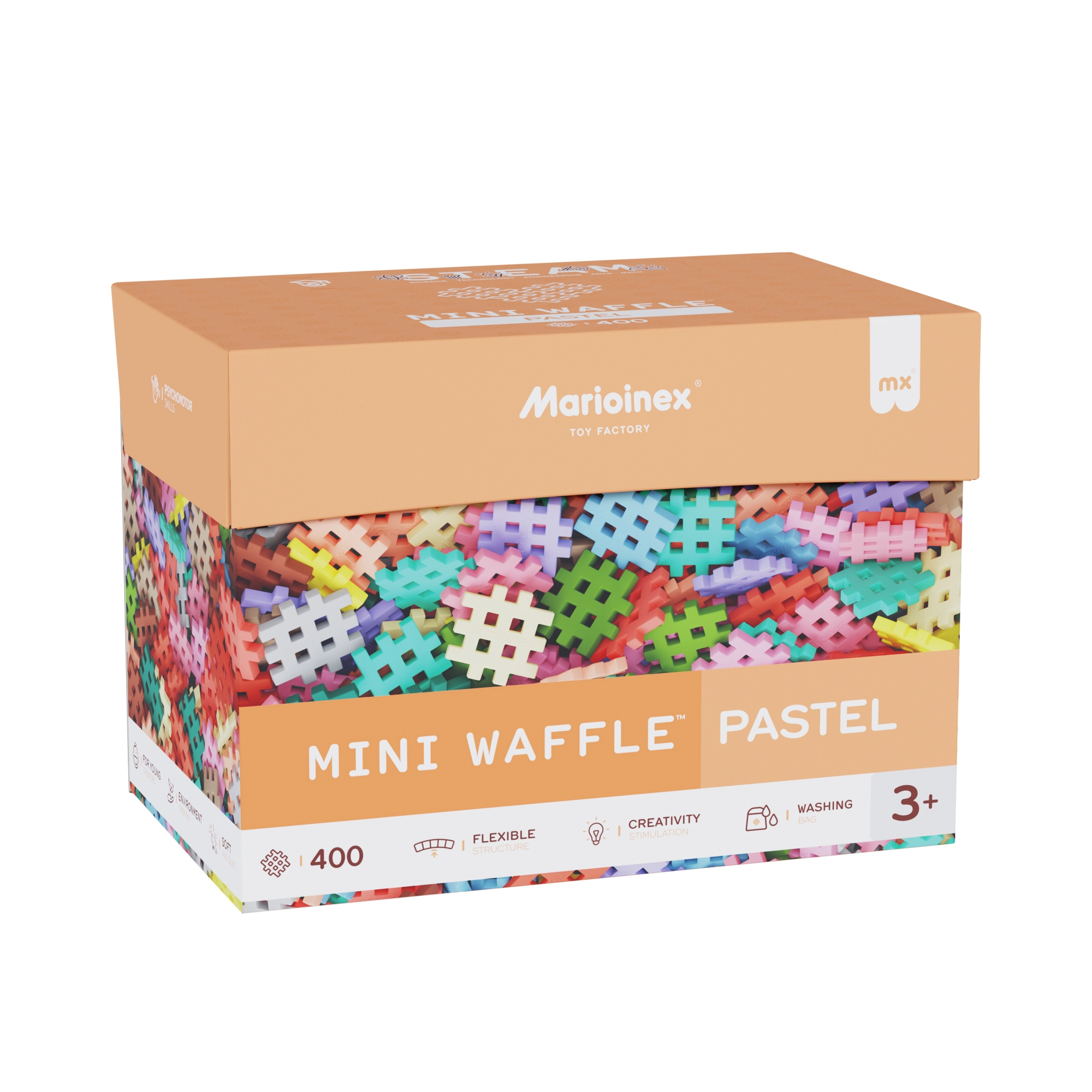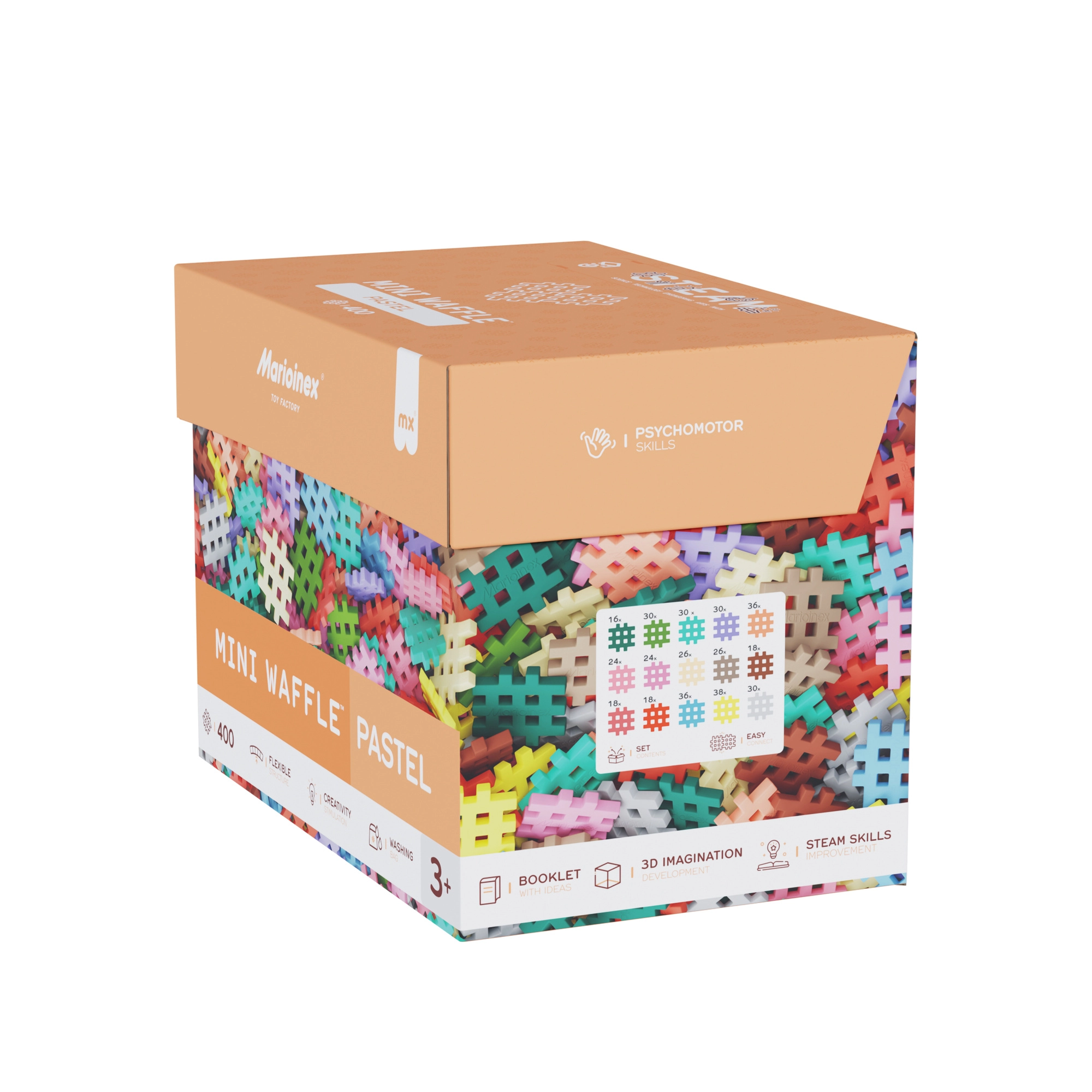 Konstrukcijska igra Mini Waffle Pastel prinaša otrokom od 3 let ure smiselne zabave. Zahvaljujoč mehkim in prožnim koščkom lahko otroci udobno ustvarjajo, tudi najmlajši graditelji. Priložena je navdihujoča knjižica za prve projekte, a prava meja je le domišljija – od figuric in živalic do izvirnih zgradb.