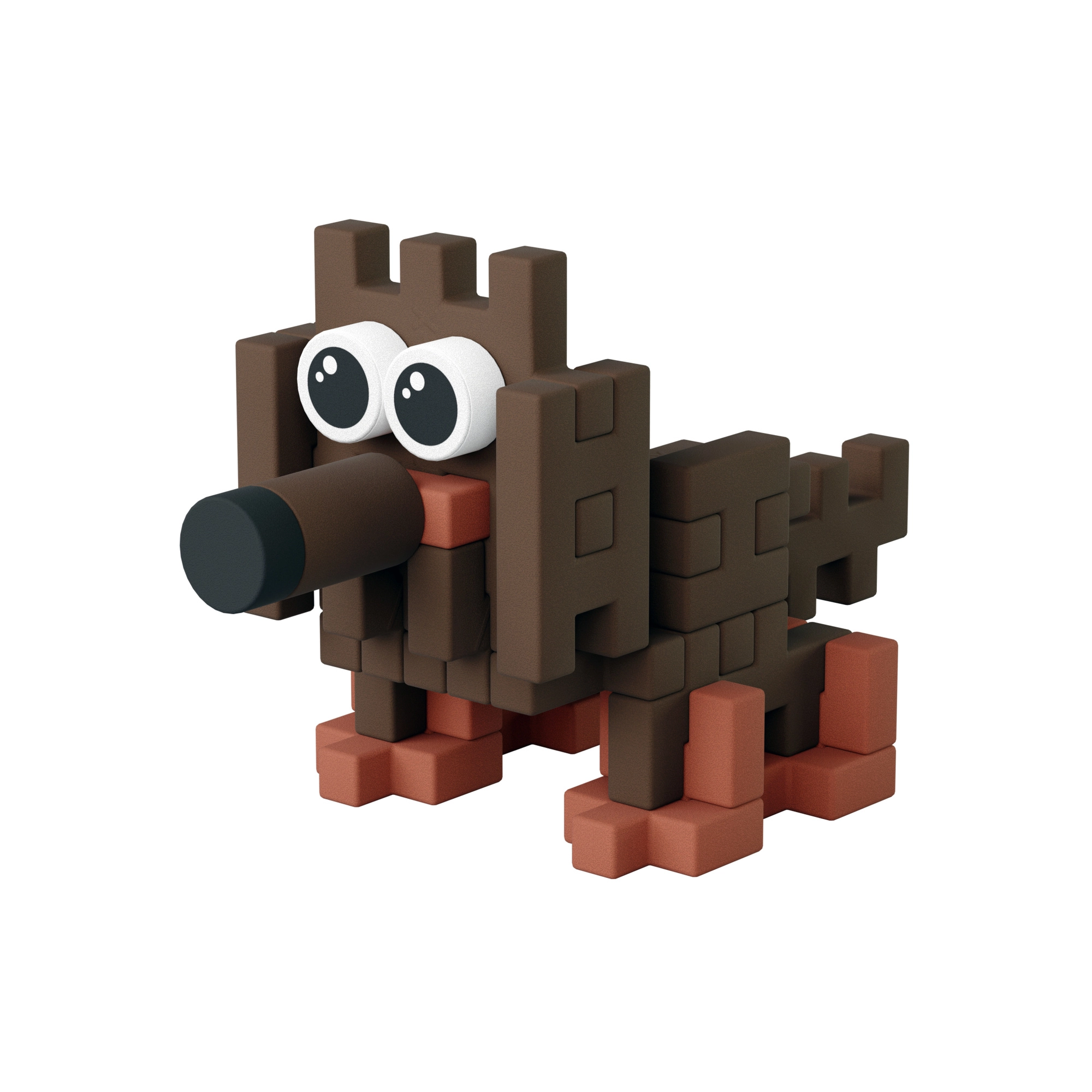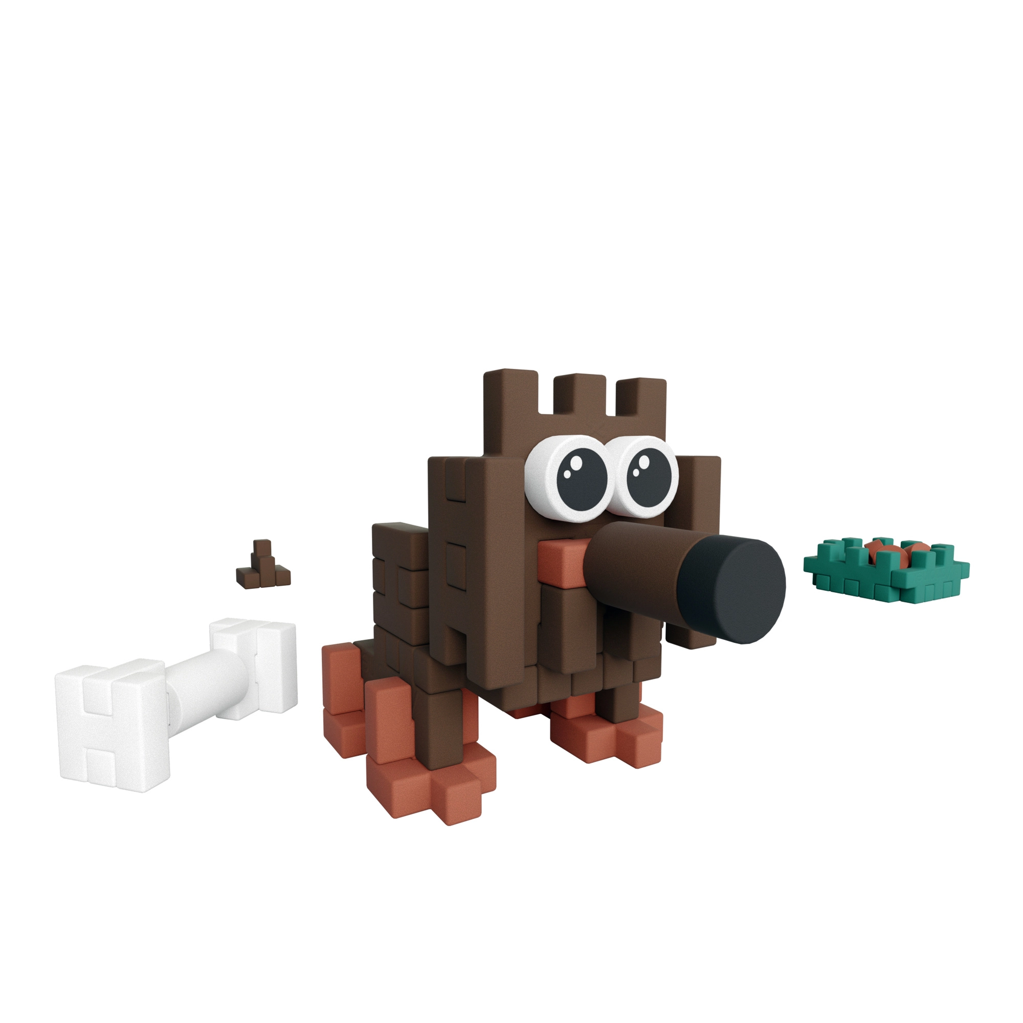 Iz 43 koščkov boste zlahka sestavili kužka z velikimi očmi in dodatke – skledico s hrano, kost in »kupček«. Odlično za pripovedovanje lastnih zgodb.