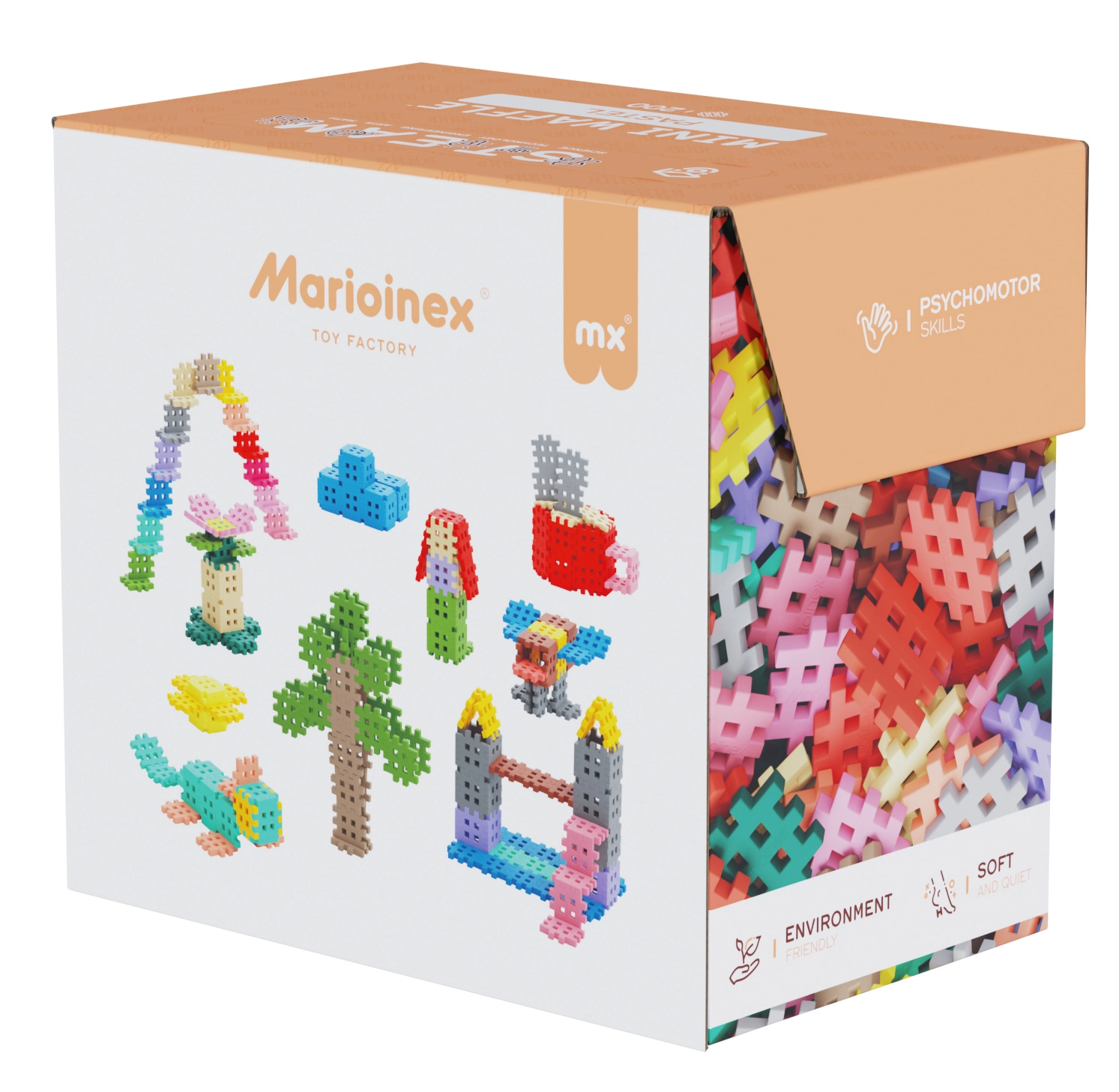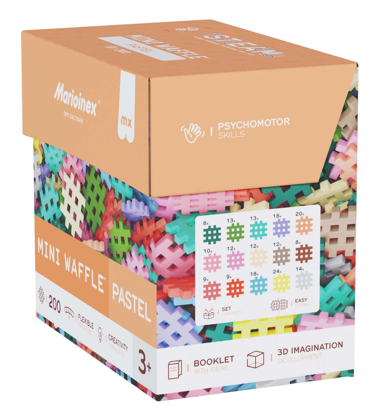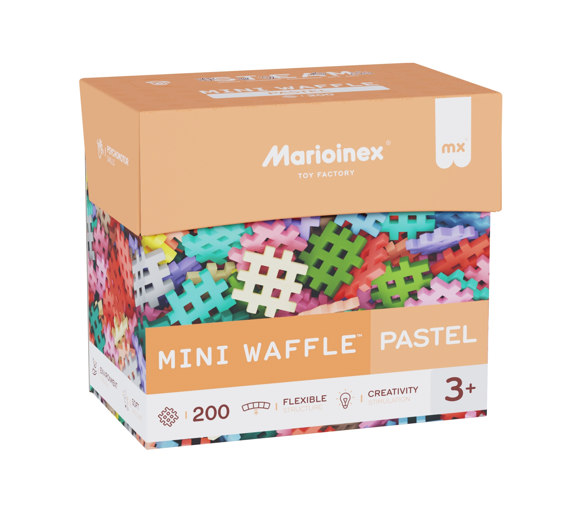 Gradbeni komplet Mini Waffle Pastel znamke Marioinex otrokom prinaša svobodo pri gradnji od preprostih oblik do zahtevnejših konstrukcij. Zaradi mehkih in prožnih delčkov se kocke zlahka spajajo in razdružujejo ter so prijetne na dotik. Pastelne barve delujejo pomirjujoče in spodbujajo k novim idejam.