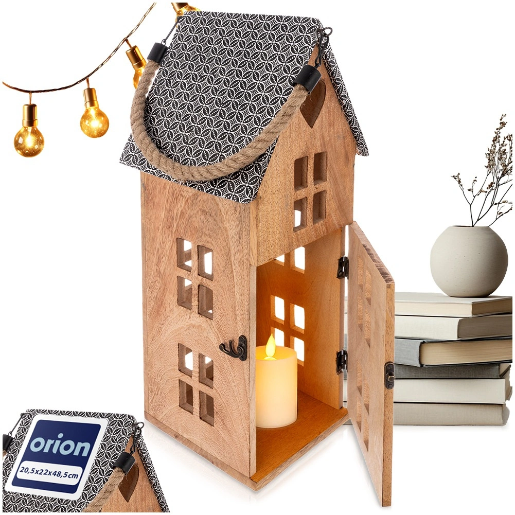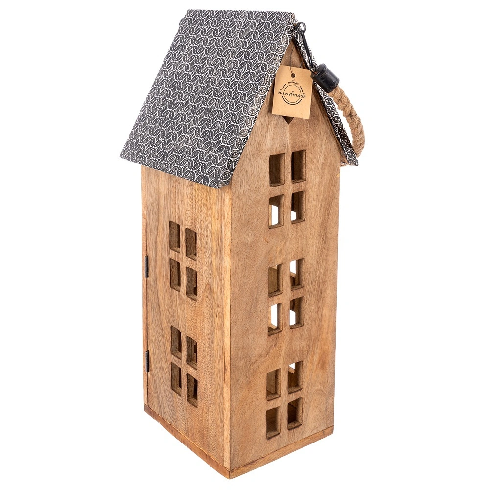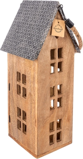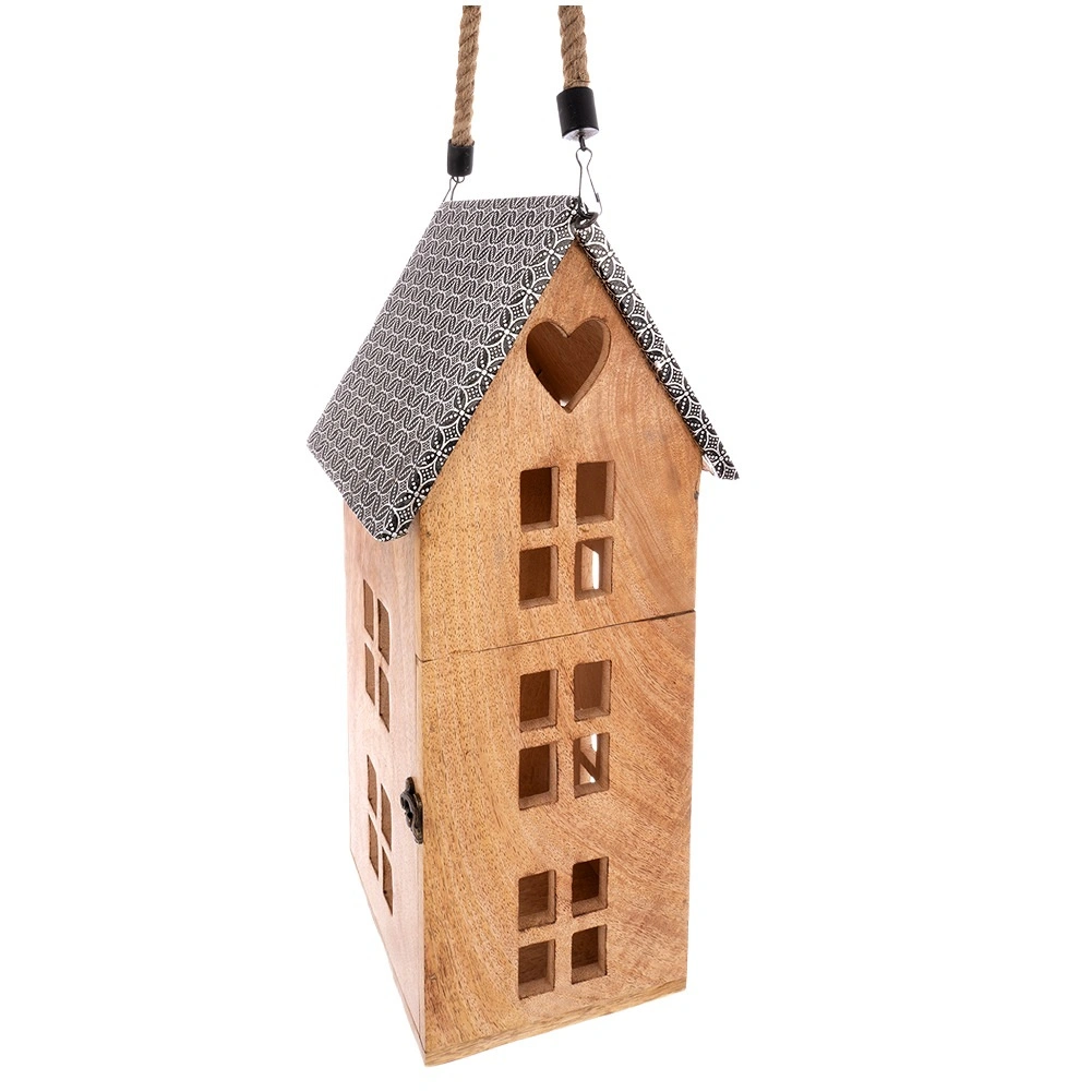 Stilski lampijon v obliki hišice iz mangovega lesa s kovinsko streho in robustnim vrvnim ročajem. Namenjen varni uporabi z LED svečo, primeren za obešanje ali postavitev. Ponuja prijetno ambientalno svetlobo, naraven videz in odpornost proti vlagi. Idealen za dnevno sobo, spalnico, na teraso ali balkon.