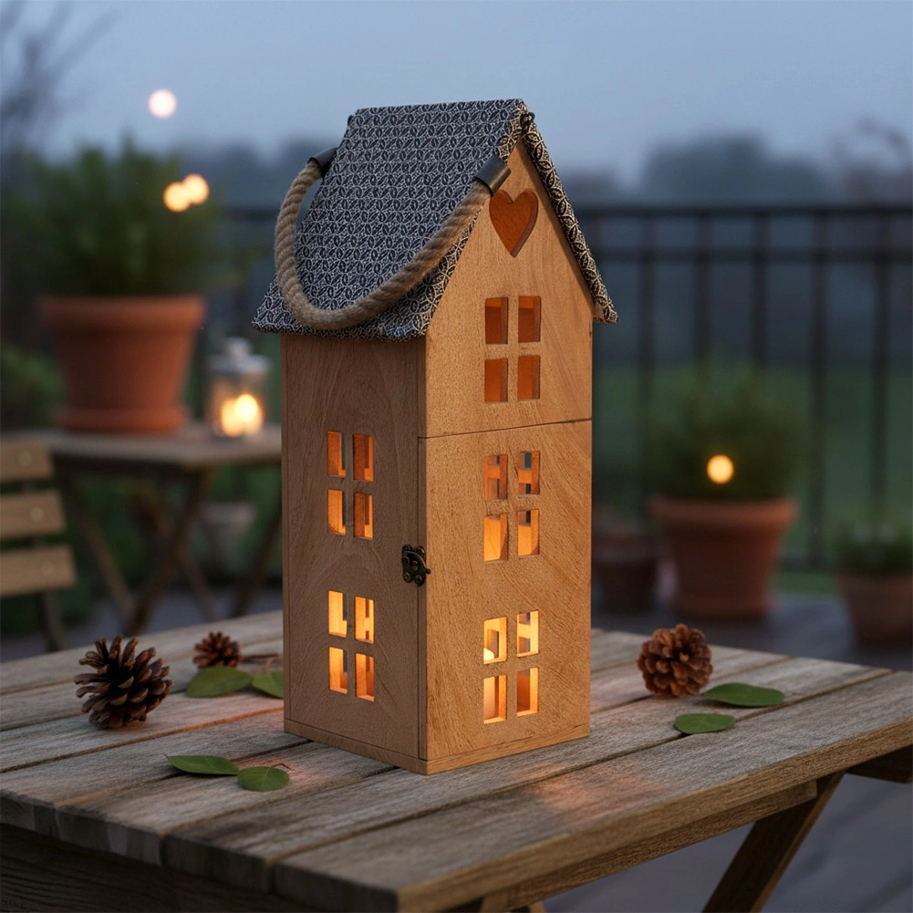 Odkrijte čar tople svetlobe z lesenim lampijonom v obliki hišice. Ročno izdelan iz mangovega lesa z naravno teksturo, dopolnjen s kovinsko streho in močnim vrvnim ročajem za enostavno prenašanje ali obešanje. Zaradi izrezov oken zvečer ustvari učinkovit svetlobni efekt, ki vsak prostor spremeni v prijeten kotiček za počitek.