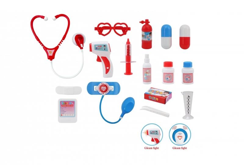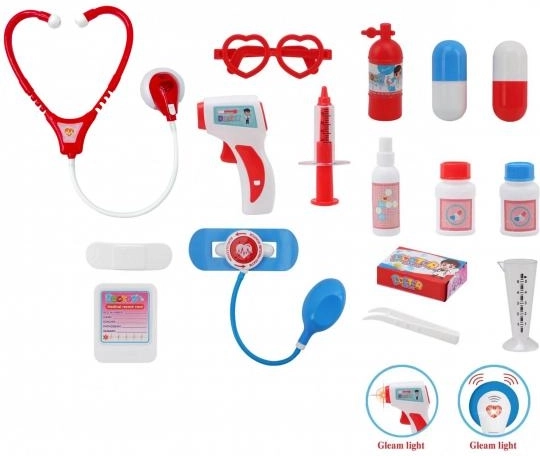 Set vključuje ključne pripomočke, kot so stetoskop z zvokom srca, svetleči termometer, injekcijska brizga, očala, ogledalce in škatlice z »zdravili« (atrape). Vse je shranjeno v trdnem in prenosnem kovčku, ki služi kot praktičen prostor za shranjevanje.