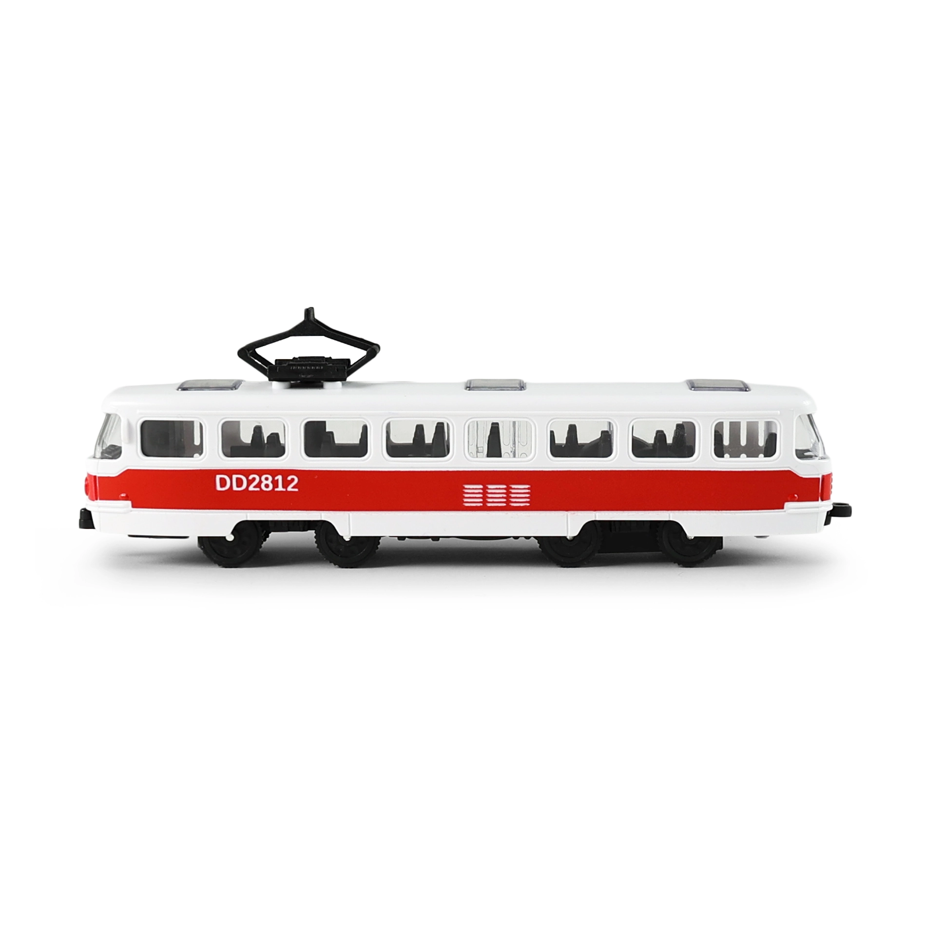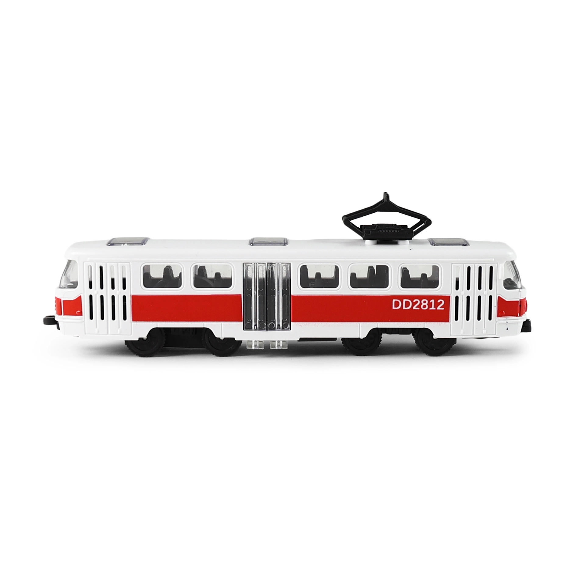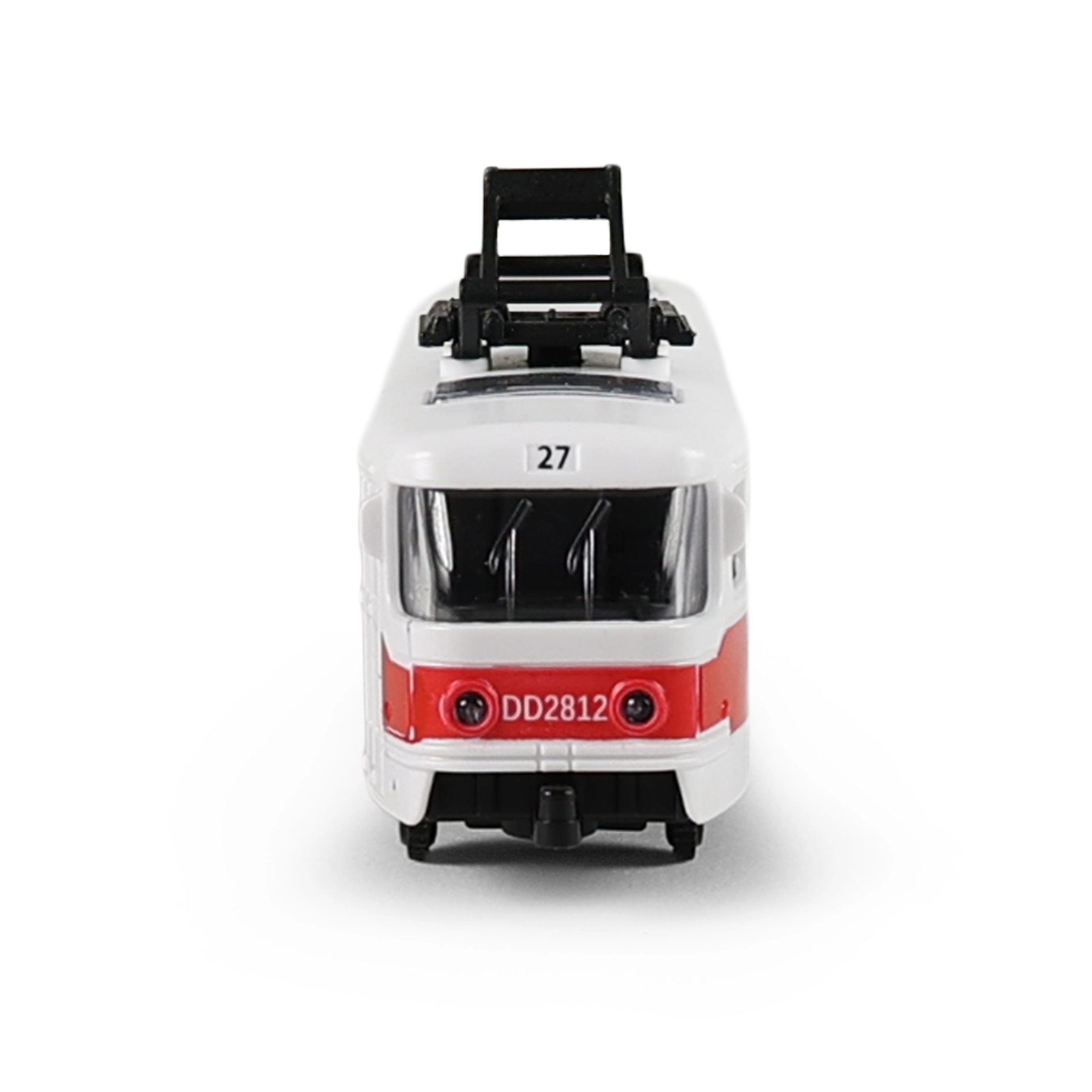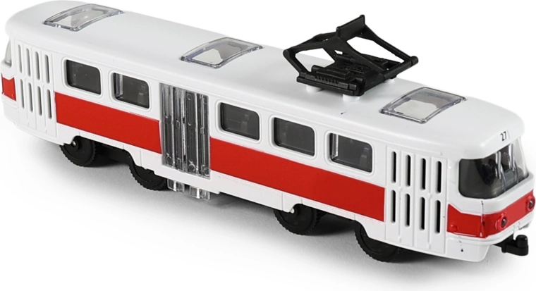 Realistična rdeče-bela tramvaj s podrobnim izdelavo oken, vrat in strešnega zbiralnika je odličen dodatek otroškemu voznemu parku. Zaradi kompaktne velikosti 16 cm se udobno prilega otroški roki in je idealna za igro doma ali na poti.