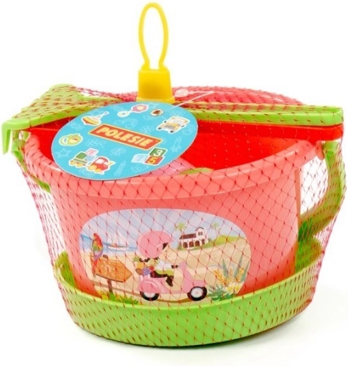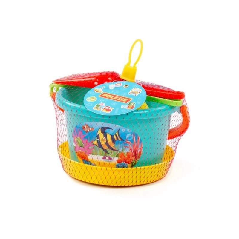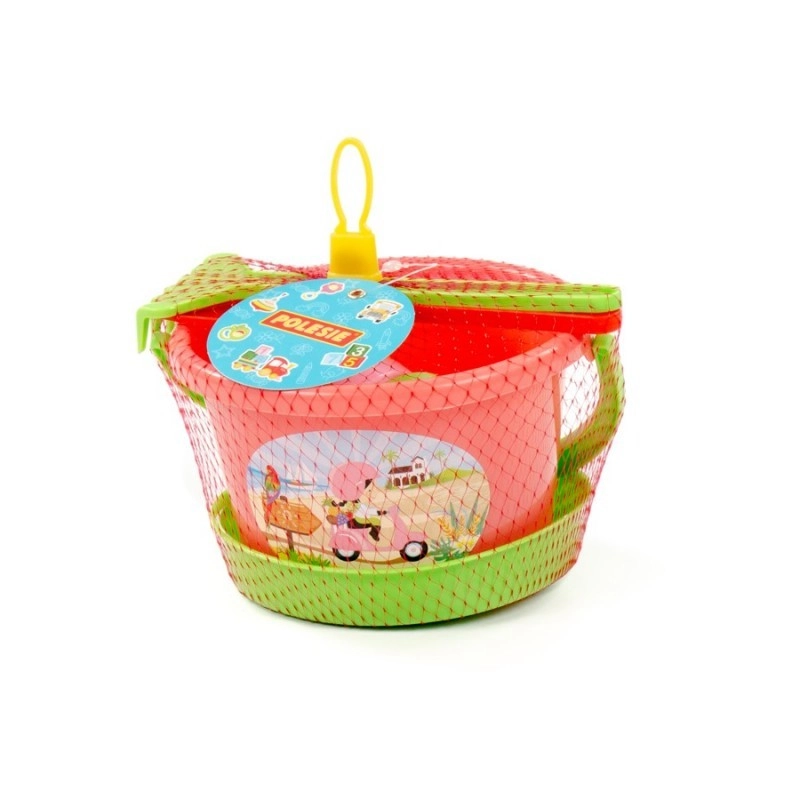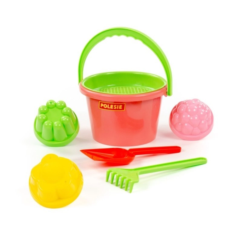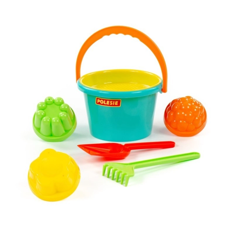 - Celovita oprema za igro v pesku – vedro, cedilo, lopatka, grabljice in modelčki.