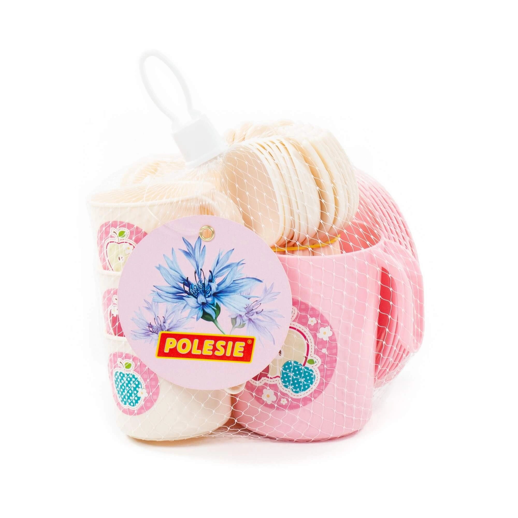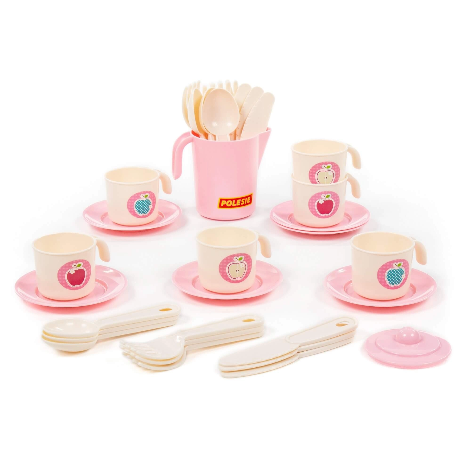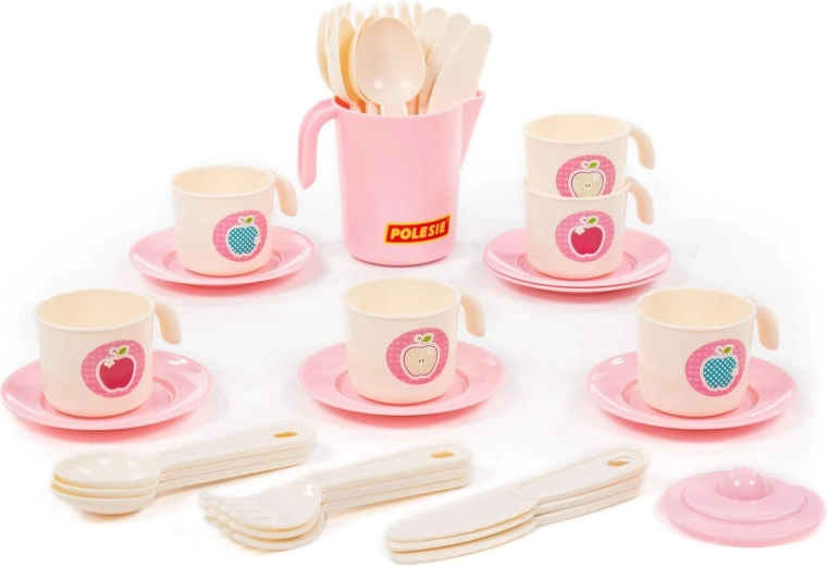 Set z 32 deli vključuje skodelice s krožnički, krožnike, pribor in čajnik – otroci imajo vse, kar potrebujejo za postrežbo pijač in dobrot.