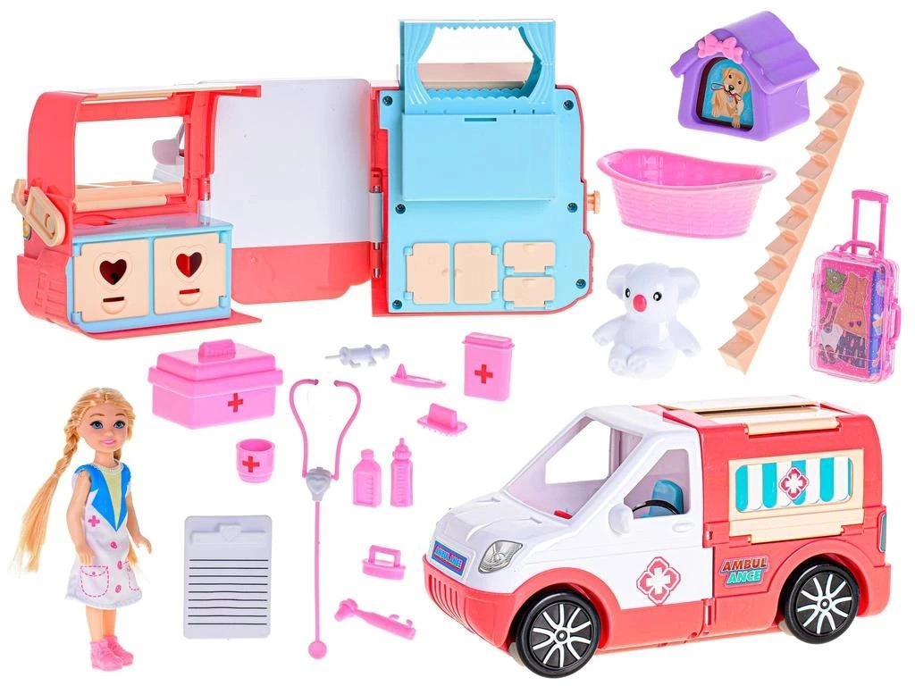 Ta mobilna klinika bo navdušila vse male negovalke in negovalce. Zahvaljujoč odpirajočim se vratom in premišljeni notranjosti se reševalno vozilo zlahka spremeni v mobilno ambulanto za ljudi in živalce. Set vključuje punčko – voznico reševalnega vozila, medicinsko opremo, kovček, živalco s transporterjem in druge dodatke za razburljive reševalne misije.