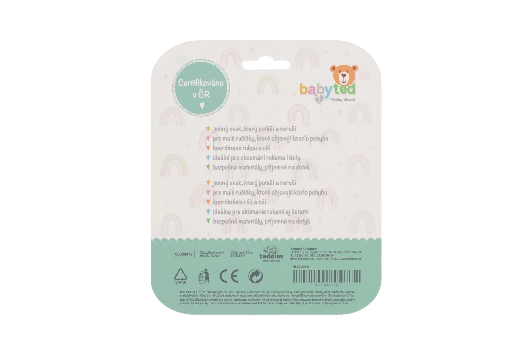 Prisrčno grizalo in ropotuljica v obliki piškota znamke BabyTed je idealna prva igrača za dojenčke že od rojstva. Mehak silikon nežno masira dlesni ob izraščanju prvih zobkov, medtem ko praktičen obroček olajša oprijem z majhnimi ročicami. Lahka zasnova podpira razvoj fine motorike, nežno rožljanje pa spodbuja slušno zaznavanje. Varna zasnova in kakovostna izdelava, certificirano v Češki republiki.