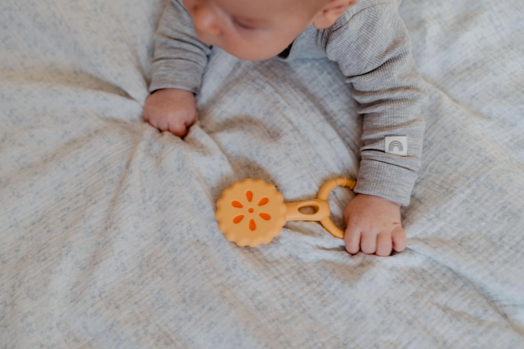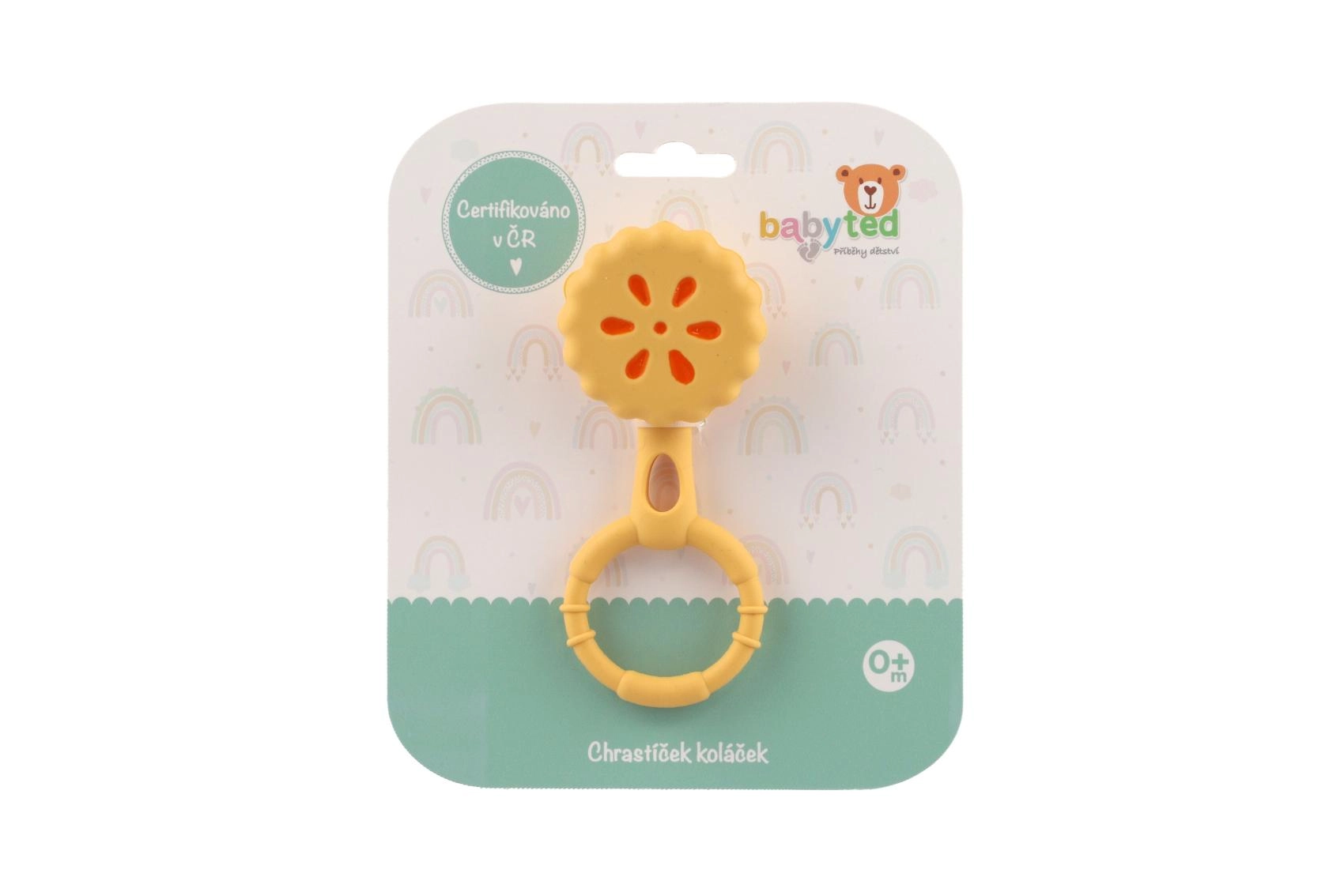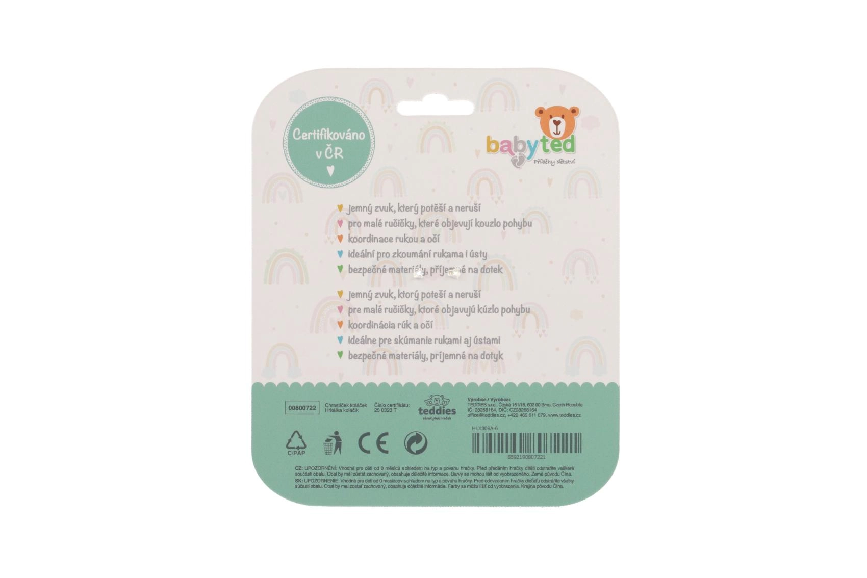 Prvi dotiki, prvi nasmehi – silikonska ropotuljica in grizalo BABYTED prinašata udobje in zabavo od 0 m+. Igriv cvetlični dizajn očara na prvi pogled, ergonomski obroček pa zagotavlja zanesljiv oprijem. Mehak silikonski material, primeren za stik z živili, je prijeten na dotik, nežen do dlesni in enostaven za čiščenje.