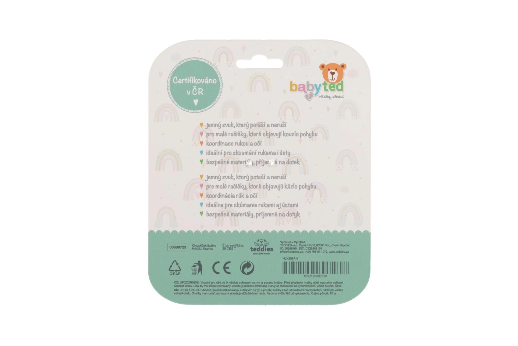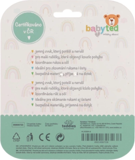 Nežno ropotanje spodbuja slušno zaznavanje in prebuja naravno radovednost. Teksturiran obroček zagotavlja zanesljiv oprijem tudi za najdrobnejše roke, gladke površine pa se enostavno čistijo. Praktično, vzdržljivo in idealno za vsakodnevno igro doma in na poti.