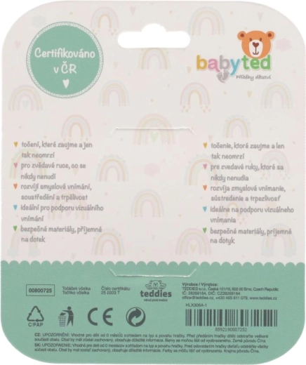 Ta vesela čebelica je idealna prva igrača za dojenčke. Zaradi kompaktne velikosti 9 × 7 cm jo dobro držijo tudi drobne rokice, gladki robovi in prijetni materiali pa zagotavljajo največjo varnost. Vrtljivi elementi prinašajo preprosto interakcijo, ki naravno razvija koordinacijo oko–roka in otrokovo radovednost.