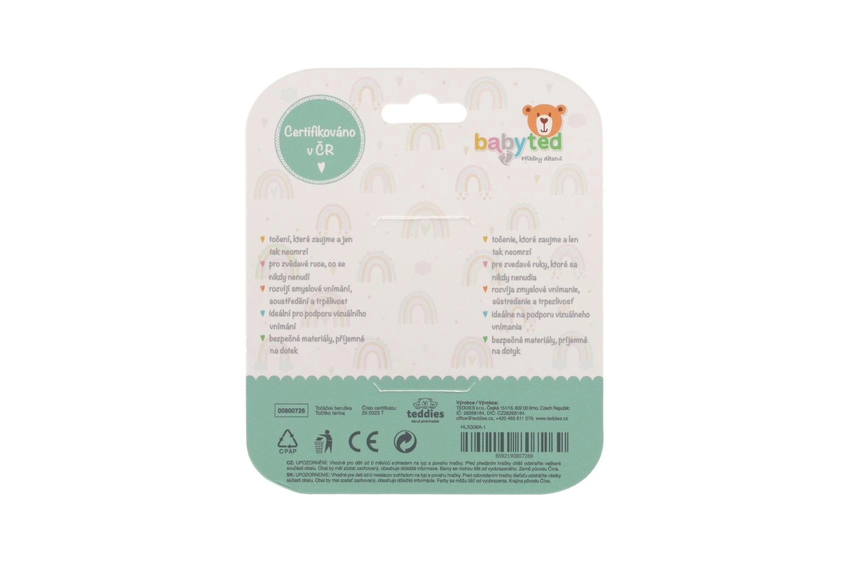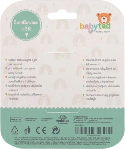 Vrteče središče in haptični elementi (mehurčki, izbokline) vabijo k stiskanju, vrtenju in raziskovanju, s čimer naravno razvijajo koordinacijske spretnosti, prijem in fino motoriko. Kontrastna rdeča s črnimi pikami in zelenim detajlom spodbujata vidno zaznavanje in ohranjata otrokovo pozornost.