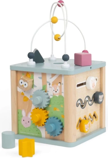 Odkrijte vsestransko leseno aktivno kocko za malčke, ki ponuja ure pametne zabave. Vsaka stran prinaša drugo dejavnost – vstavljanje oblik, zobniki, kroglična steza in koralni labirint na vrhu. Izdelano iz 100 % FSC certificiranega lesa v nežnih pastelnih barvah za varno igro ter razvoj fine motorike, koordincije oko–roka in reševanja problemov.