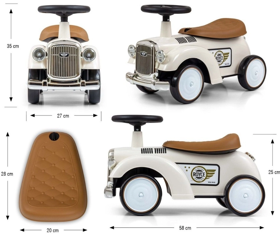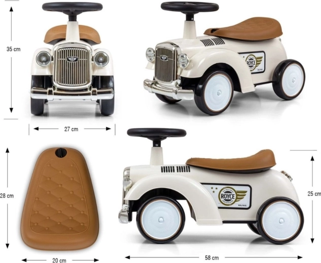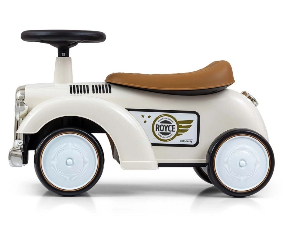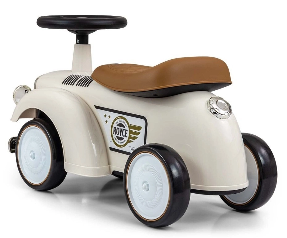 Poganjalec Royce izstopa z vintage videzom s kromiranimi detajli in emblemom ROYCE, ki mu daje prestižen značaj. Zaradi širokih in stabilnih koles ter prijetno oblikovanega sedeža je idealen kot prvo vozilo za otroke, ki že znajo samostojno sedeti. Vrtljiv volan omogoča lahko manevriranje v notranjih prostorih in na sprehodu.