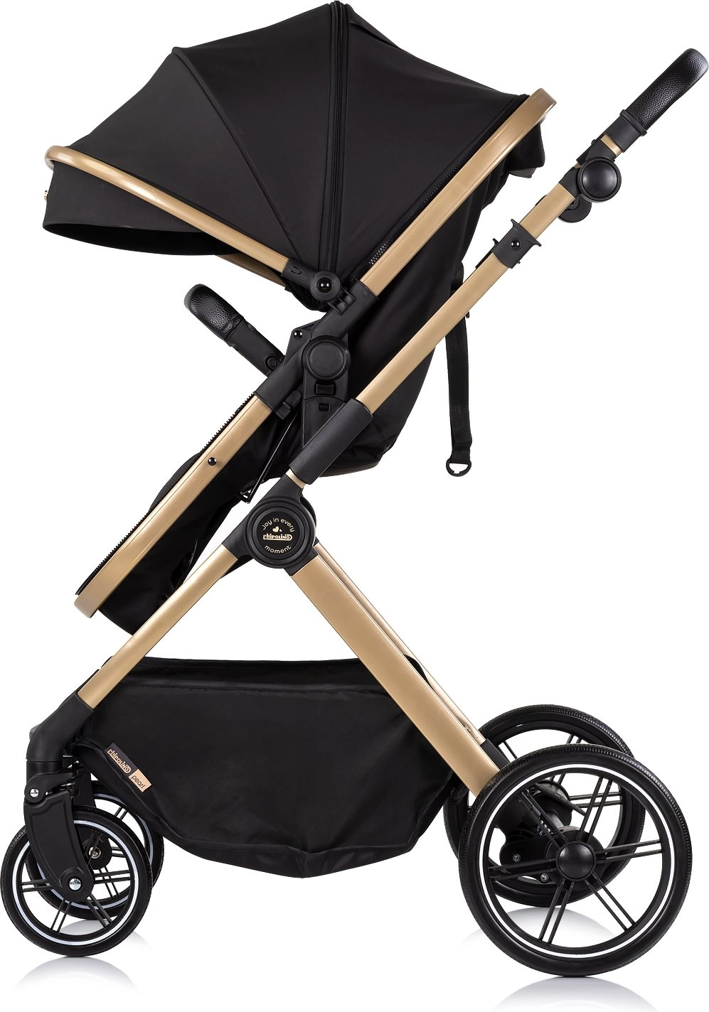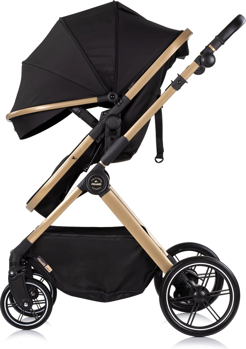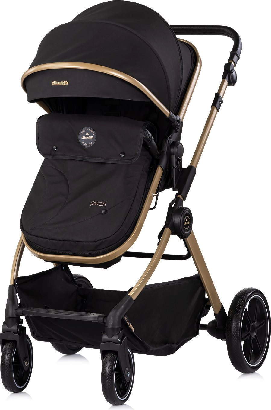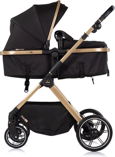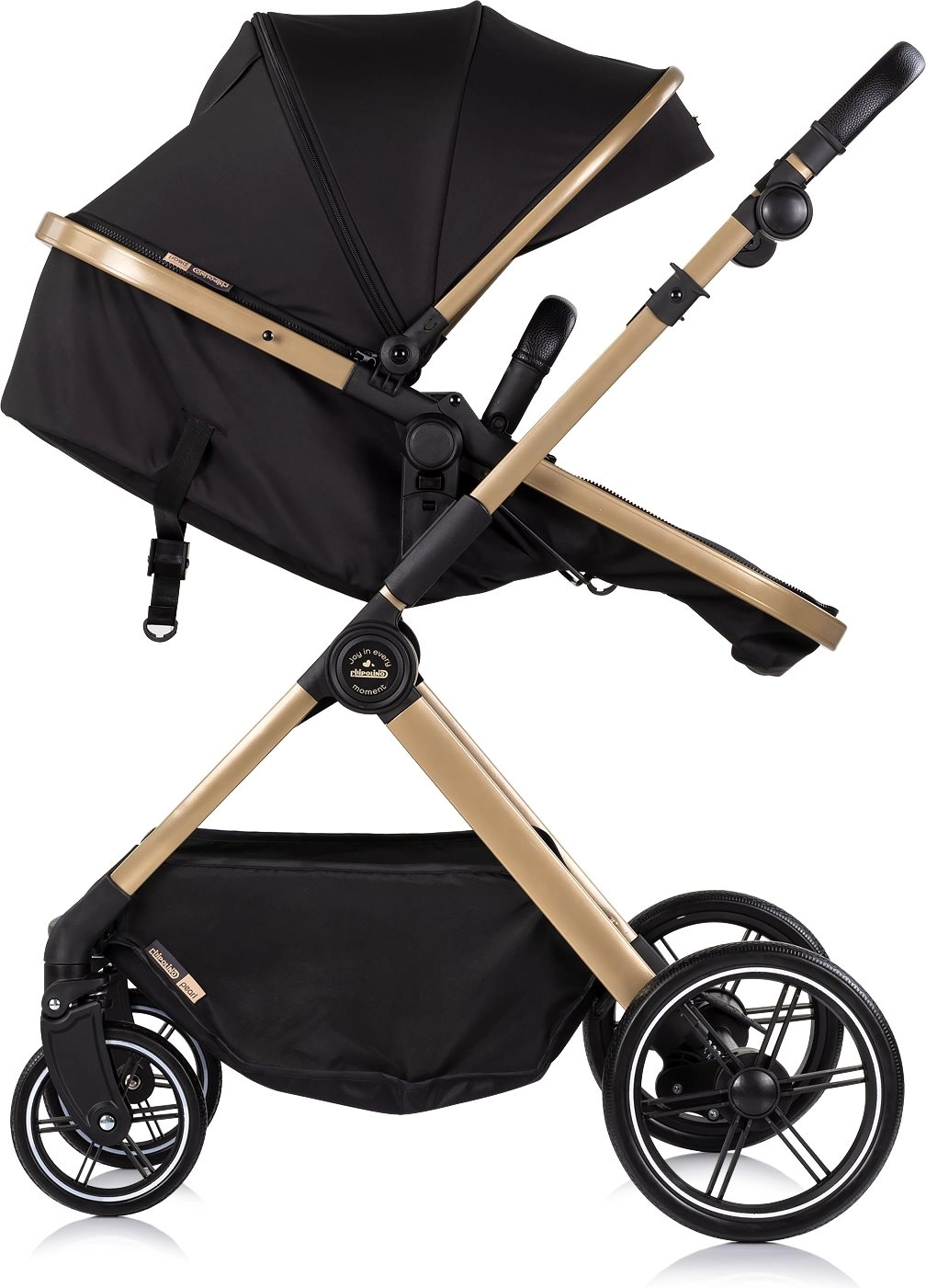 Voziček Chipolino Pearl 2v1 raste z vašim otrokom – z enim gibom ga spremenite v udobno globoko košaro za novorojenčka, kasneje pa v prostoren športni sedež s 5-točkovnimi pasovi. Velika razširljiva strešica z okencem nudi senco in zasebnost, detajli iz PU usnja pa dodajo prestižen videz in enostavno vzdrževanje.