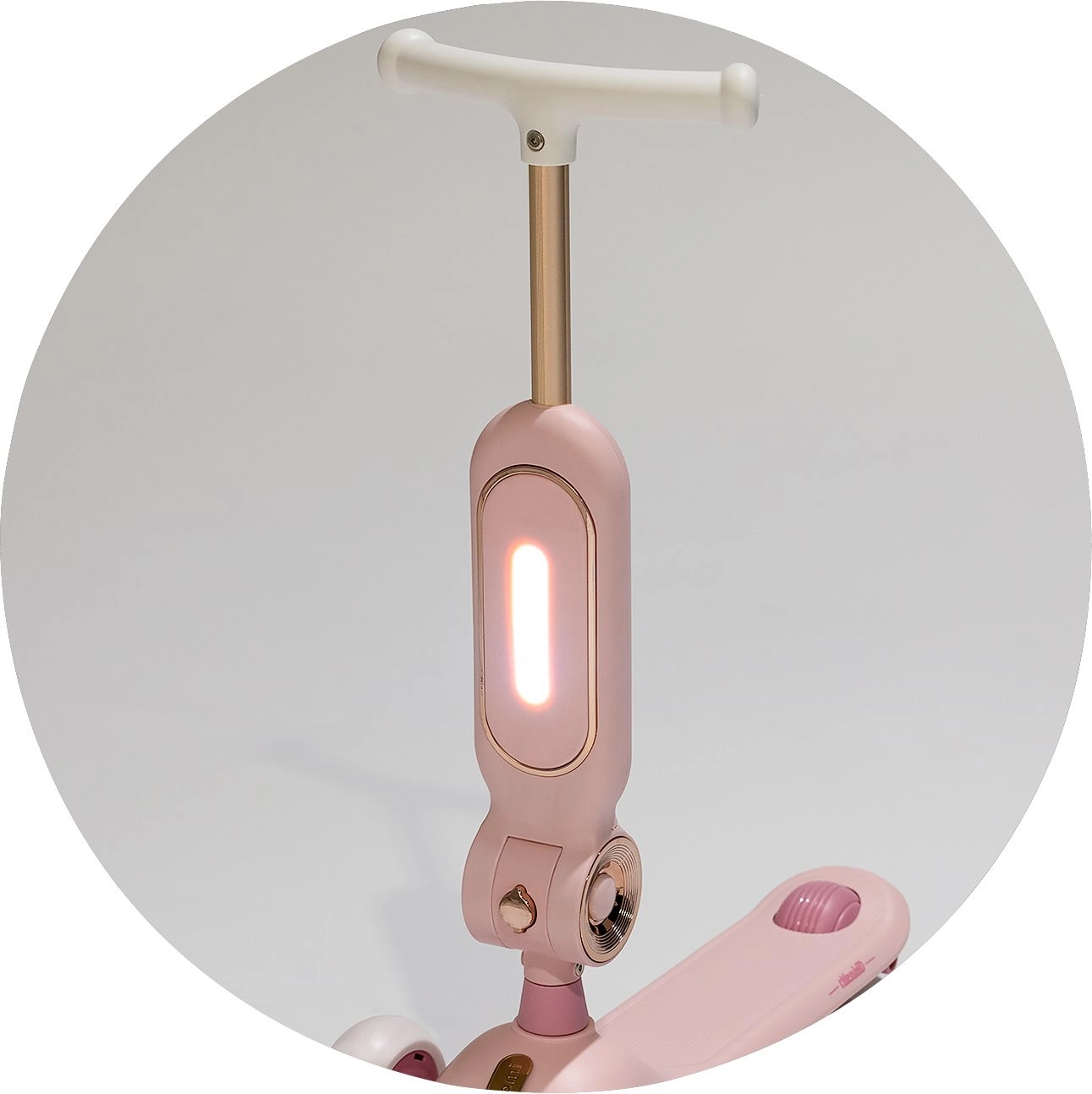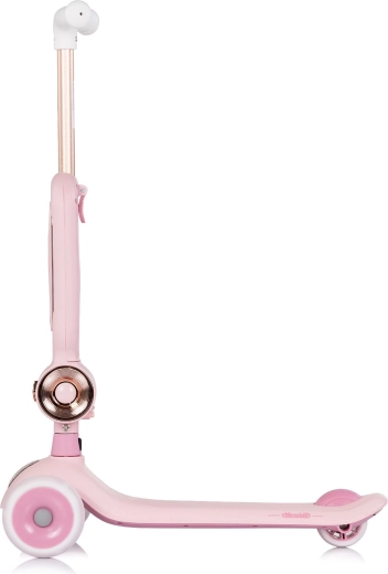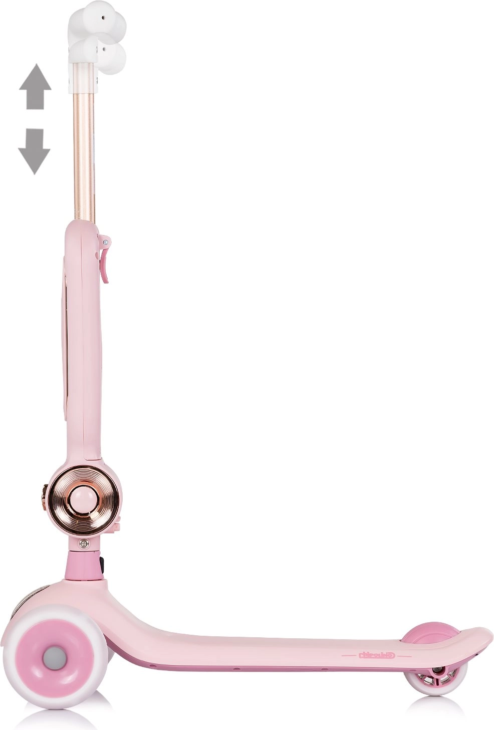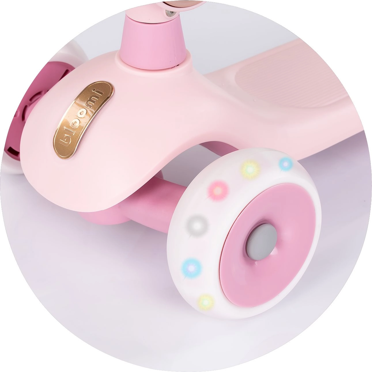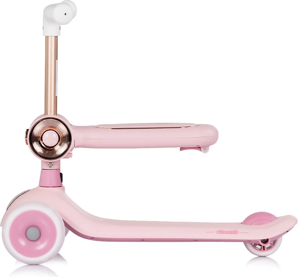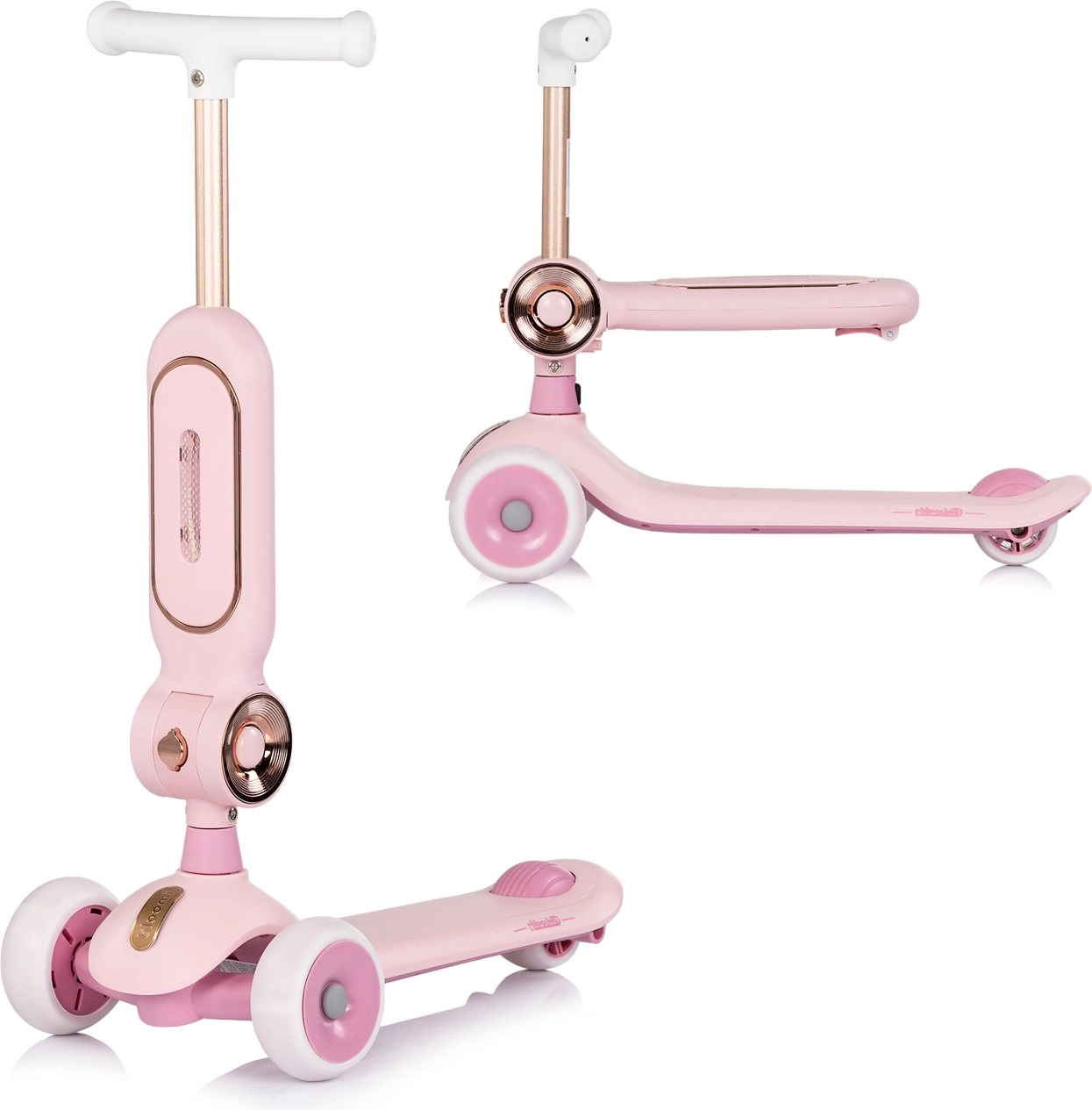 Otroški skiro 2v1 CHIPOLINO Bloomi v rožnati barvi združuje skiro in poganjalec za maksimalno vsestranskost. Ponuja stabilno trikolesno zasnovo, svetleča PU kolesa, široko protidrsno stopalno površino in zadnjo nožno zavoro za varno in zabavno vožnjo. Sedež nudi oporo mlajšim otrokom in podpira razvoj ravnotežja in koordinacije.
