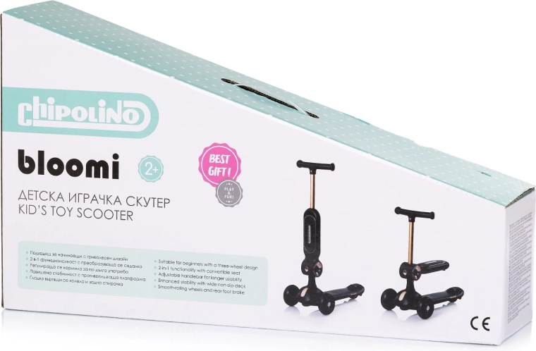 Skiro/poganjalec CHIPOLINO Bloomi 2v1 je idealna izbira za prve vožnje vaših otrok. Zahvaljujoč sedežu se najmlajši lahko poganjajo sede in postopoma preidejo na samostojno vožnjo stoje. Trikolesna konstrukcija zagotavlja visoko stabilnost, medtem ko široka protidrsna stopalka in zadnja nožna zavora prinašata zanesljivost pri vsakem koraku.