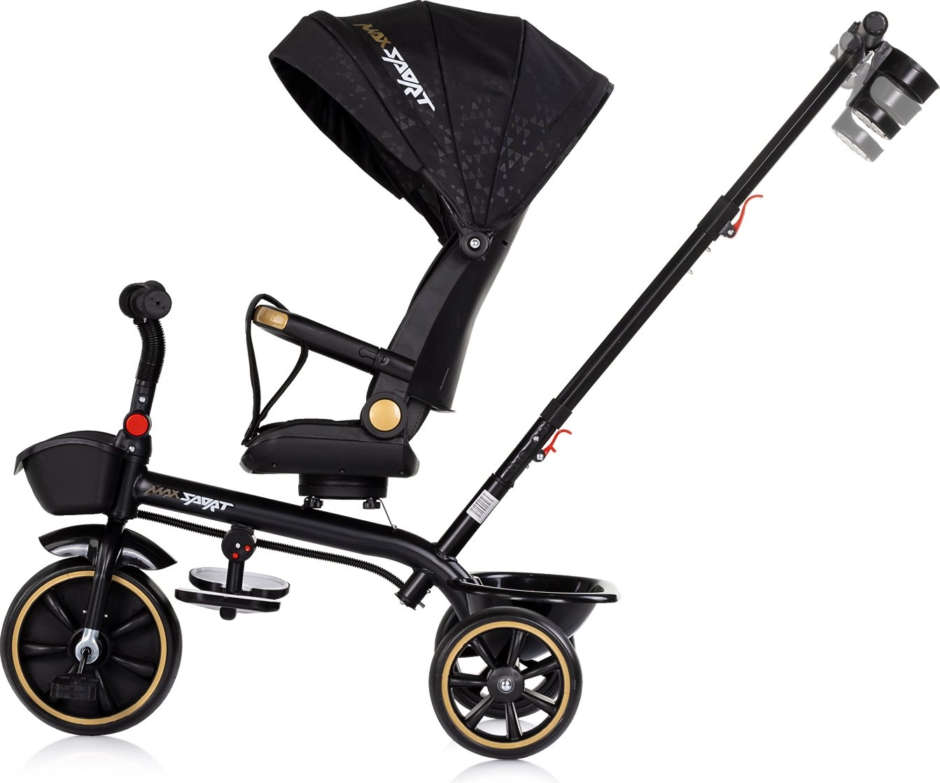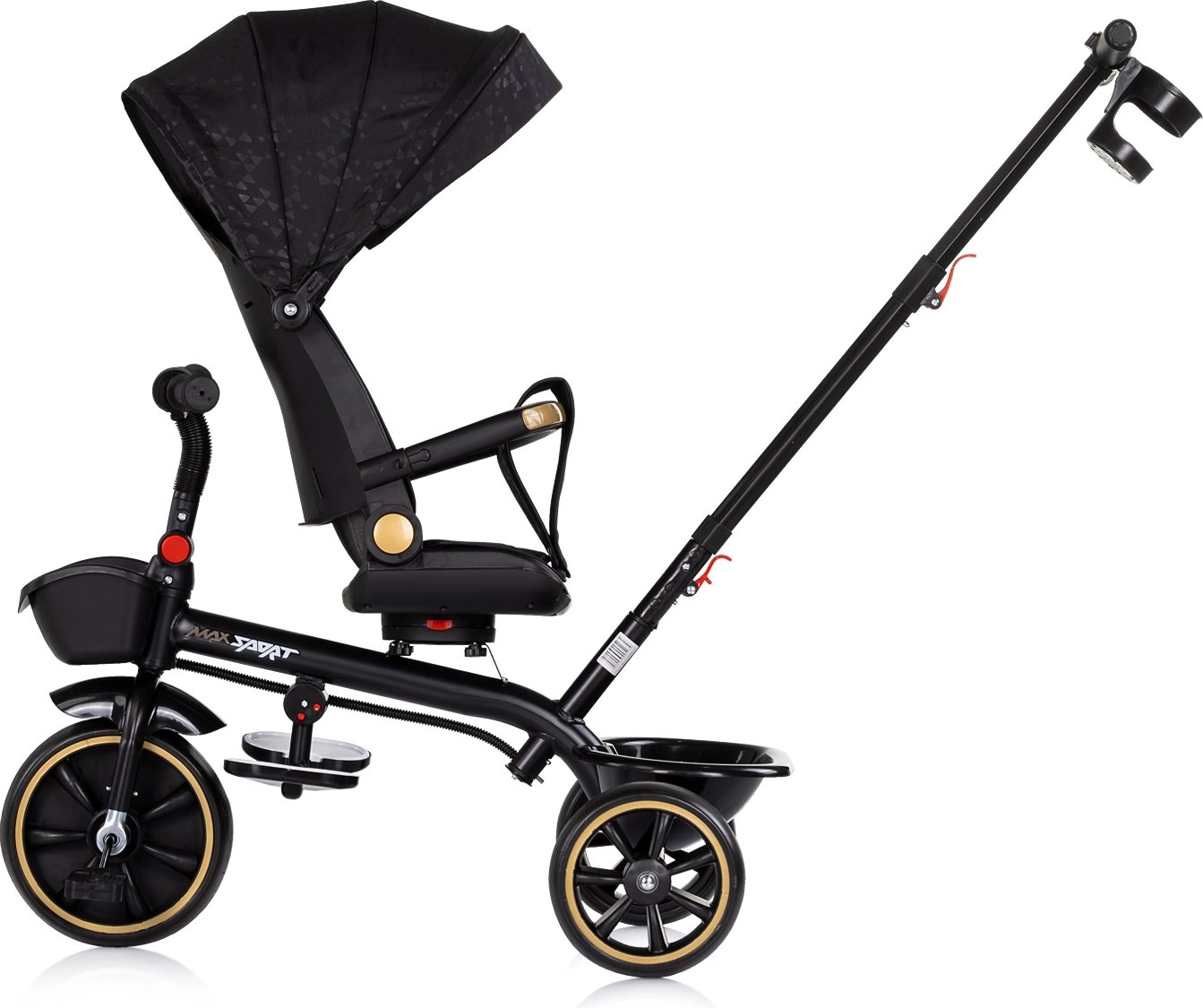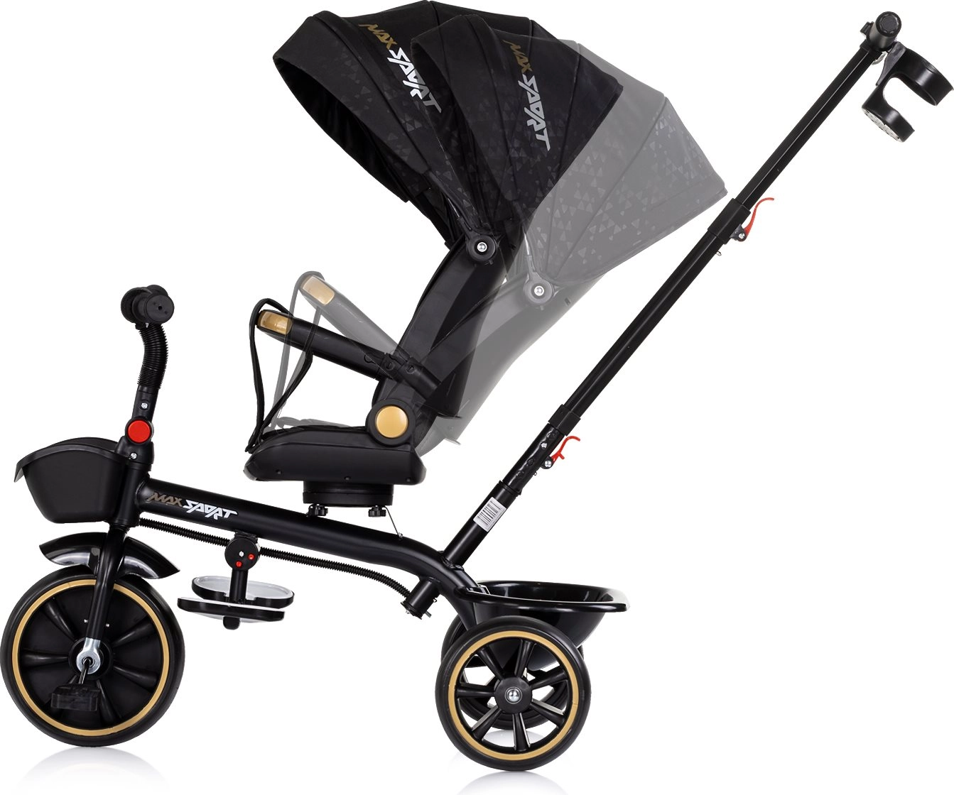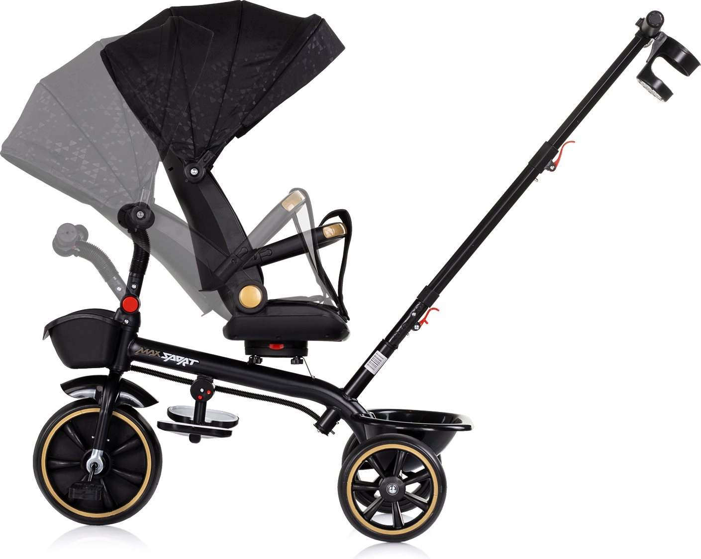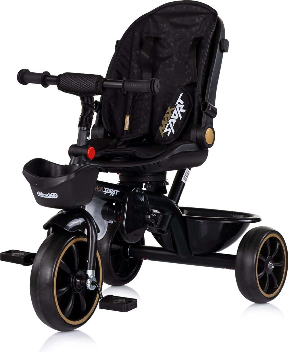 Univerzalni otroški tricikel 2v1 CHIPOLINO Max Sport Noir raste z vašim otrokom – od načina z vodenjem staršev do samostojne vožnje. Ponuja vrtljiv sedež za 360°, nastavljiv naklon, odstranljivo strešico s senčnikom, varnostni pas in zaščitni odbijač. Zahvaljujoč nastavljivemu ročaju, zložljivim oporam za noge in shranjevalnim košaricam spredaj in zadaj je idealen za udobne in varne vožnje.
